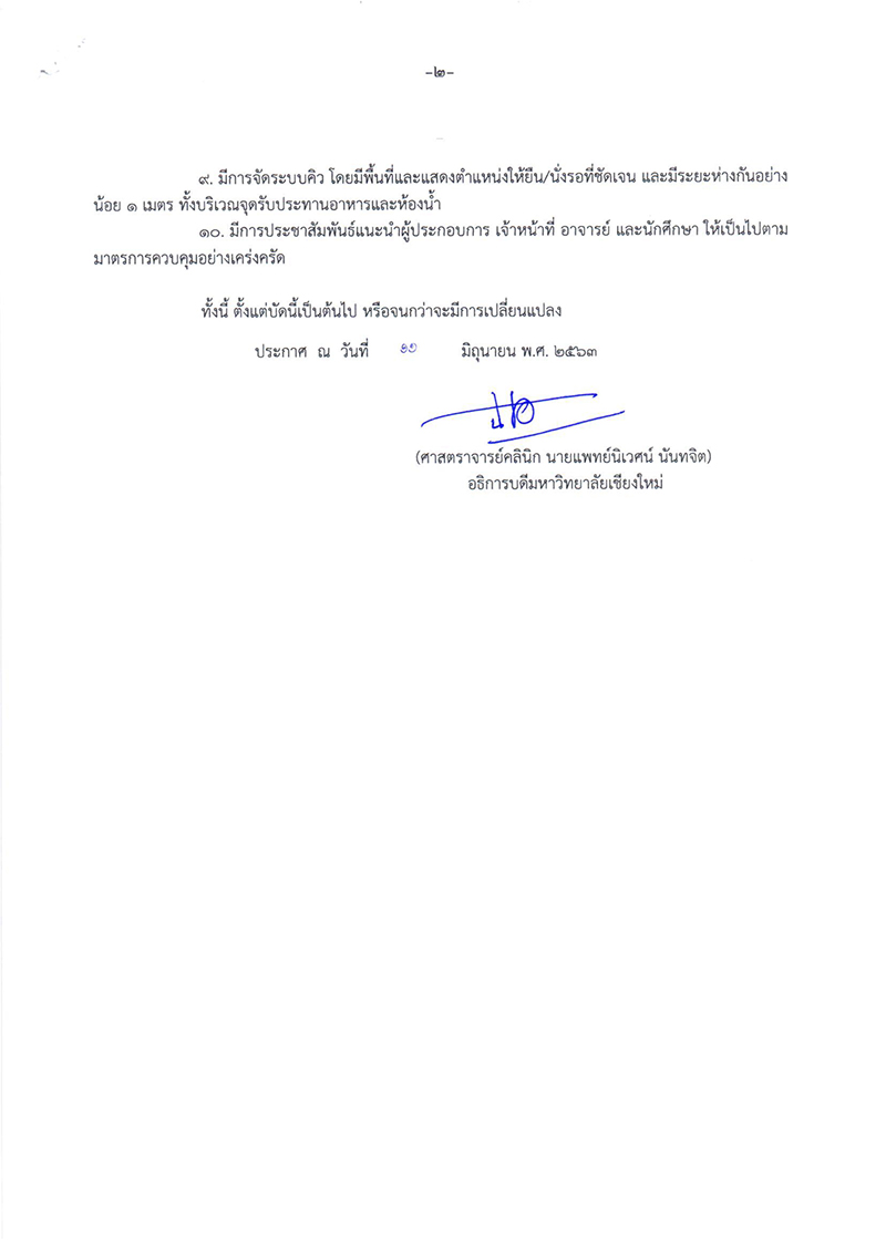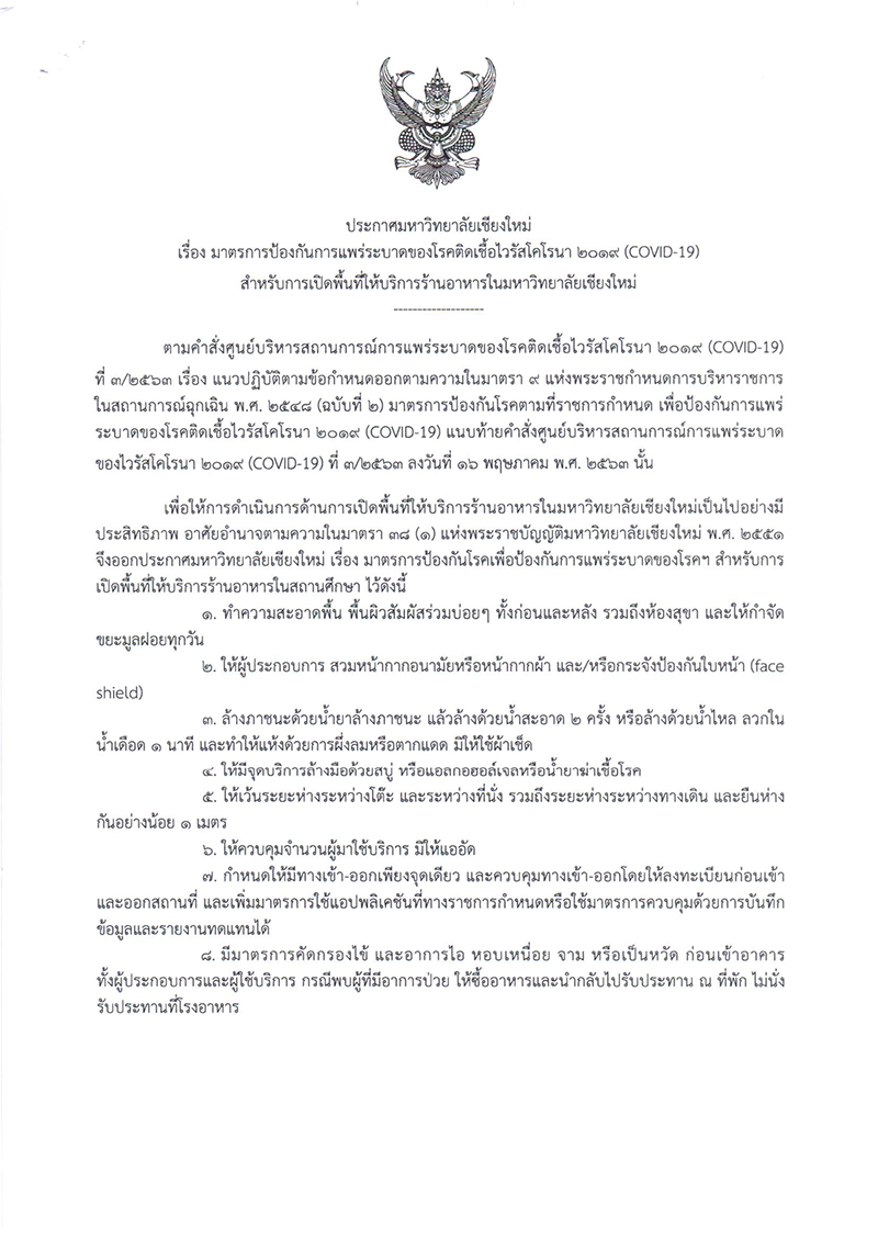 ประกาศ มาตรการป้องกัน สำหรับการเปิดพื้นที่ให้บริการร้านอาหารในมหาวิทยาลัยเชียงใหม่