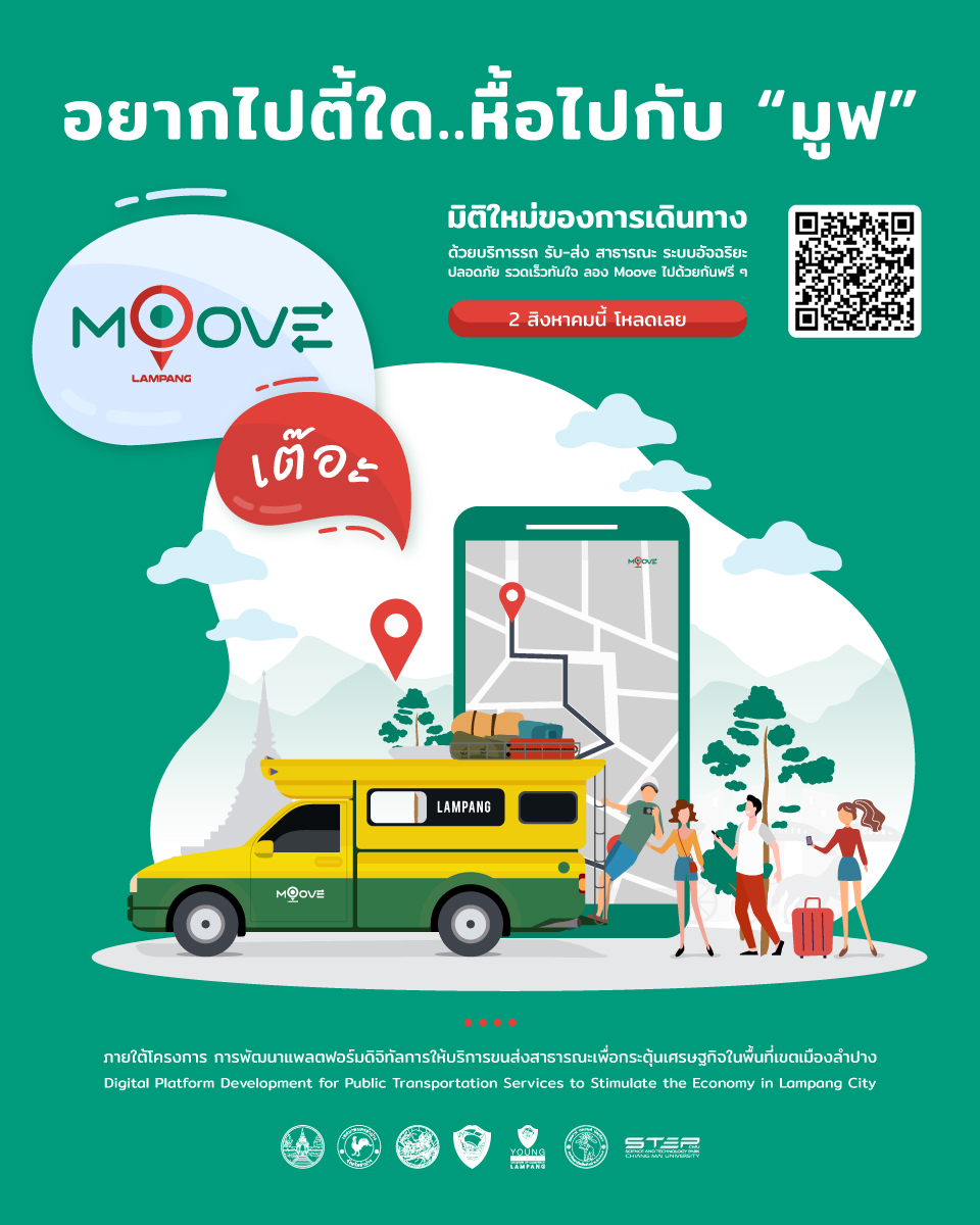 จังหวัดลำปางผนึกกำลังสำนักงานขนส่งจังหวัดลำปาง เทศบาลนครลำปาง หอการค้าจังหวัดลำปาง และกลุ่มผู้ประกอบการรุ่นใหม่ (YEC) จัดแถลงข่าวกิจกรรมการพัฒนา Mobile Application “MooVe” แพลตฟอร์มดิจิทัลบริการขนส่งสาธารณะ ณ สำนักงานประชาสัมพันธ์ ศาลากลางจังหวัดลำปาง ภายใต้โครงการการพัฒนาแพลตฟอร์มดิจิทัลการให้บริการขนส่งสาธารณะกระตุ้นเศรษฐกิจในพื้นที่เขตเมืองลำปาง หอการค้าจังหวัดลำปาง และ มหาวิทยาลัยเชียงใหม่ โดยการสนับสนุนจากกระทรวงการอุดมศึกษา วิทยาศาสตร์ วิจัย และนวัตกรรม ร่วมดำเนินการพัฒนาระบบขนส่งมวลชนอัจฉริยะ พร้อมนำเทคสตาร์ทอัพร่วมพัฒนาแพลตฟอร์มดิจิทัล เตรียมเปิดให้ประชาชนและนักท่องเที่ยวจังหวัดลำปางทดลองใช้งานวันที่ 2 สิงหาคม - 18 กันยายนนี้