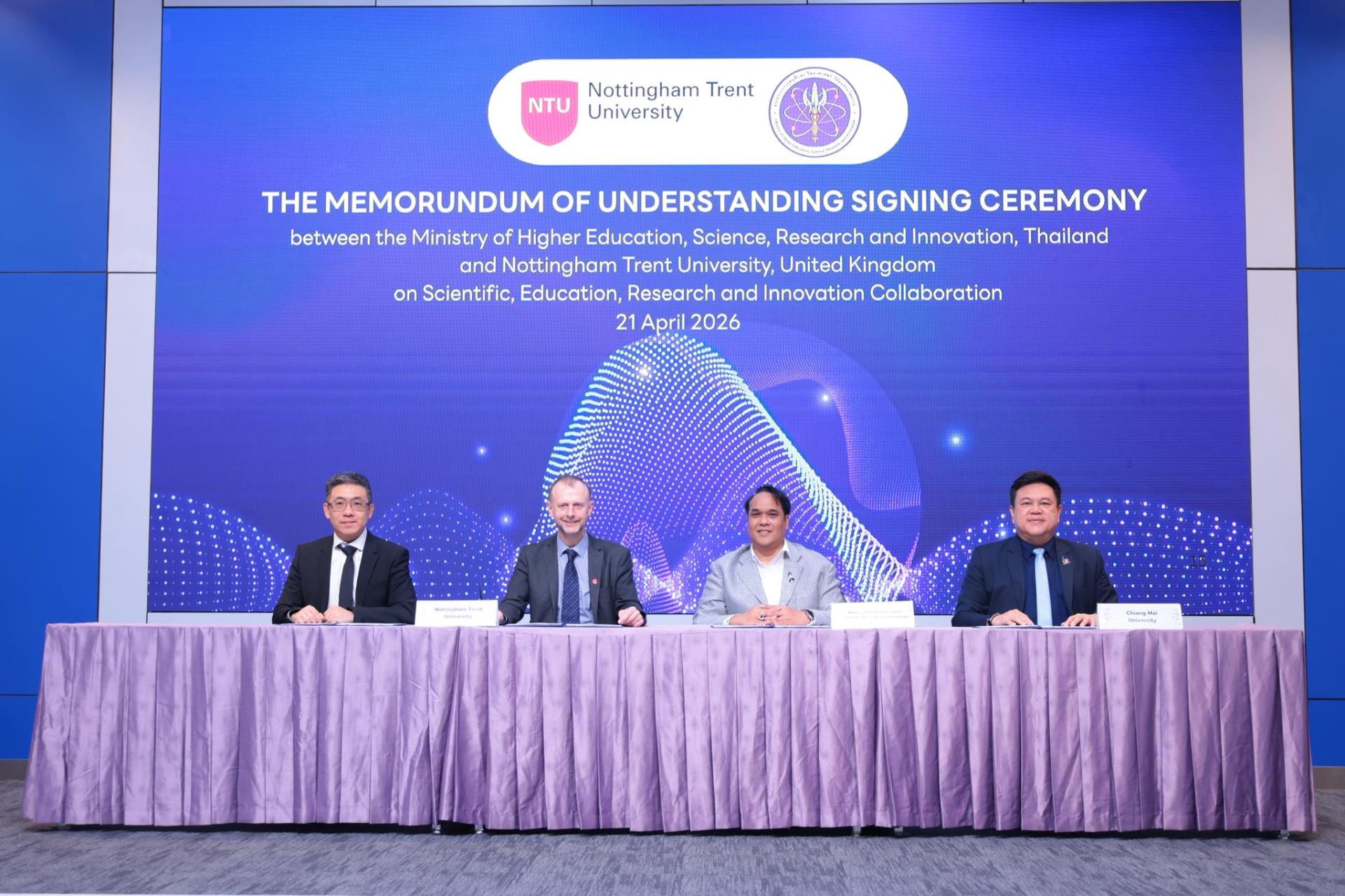 เมื่อวันที่ 21 เม.ย. ดร.พันธุ์เพิ่มศักดิ์ อารุณี รองปลัดกระทรวงการอุดมศึกษา วิทยาศาสตร์ วิจัยและนวัตกรรม (อว.) เข้าร่วมพิธีลงนามบันทึกความเข้าใจความร่วมมือระหว่างกระทรวง อว. กับ มหาวิทยาลัยนอตติงแฮมเทรนต์ โดยมี ศ.เดวิด เพทลีย์ อธิการบดีและประธานมหาวิทยาลัย ศ.เซียว หม่า ผู้อำนวยการศูนย์การเปลี่ยนแปลงธุรกิจและอุตสาหกรรม พร้อมด้วย ผศ.ดร.ธัญญานุภาพ อานันทนะ รองอธิการบดี มหาวิทยาลัยเชียงใหม่ และ รศ.ดร.ปิติวัฒน์ วัฒนชัย ผู้อำนวยการอุทยานวิทยาศาสตร์และเทคโนโลยี มหาวิทยาลัยเชียงใหม่ เข้าร่วม ณ ห้องแถลงข่าวชั้น 1 อาคารพระจอมเกล้า สำนักงานปลัดกระทรวง อว.
