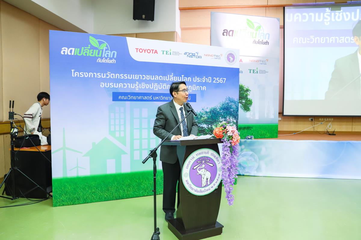 ศาสตราจารย์ (เชี่ยวชาญพิเศษ) ดร.ธรณินทร์ ไชยเรืองศรี คณบดีคณะวิทยาศาสตร์ ร่วมเป็นเกียรติในพิธีเปิด และกล่าวต้อนรับผู้เข้าร่วมการอบรมความรู้เชิงปฏิบัติการระดับภูมิภาค (ภาคเหนือ) โครงการนวัตกรรมเยาวชนเปลี่ยนโลก ประจำปี 2567 ในหัวข้อ Carbon Neutral Society ภายใต้โครงการโตโยต้าเมืองสีเขียว โดยความร่วมมือระหว่าง บริษัท โตโยต้า มอเตอร์ ประเทศไทย จำกัด สถาบันสิ่งแวดล้อมไทย (TEI) และศูนย์นาโนเทคโนโลยีแห่งชาติ (นาโนเทค) สำนักงานพัฒนาวิทยาศาสตร์และเทคโนโลยีแห่งชาติ (สวทช.) และคณะวิทยาศาสตร์ มหาวิทยาลัยเชียงใหม่ ในวันอังคารที่ 30 กรกฎาคม 2567 ณ ห้องประชุมประเสริฐฤกษ์เกรียงไกร ชั้น 4 สถาบันวิจัยและพัฒนาพลังงานนครพิงค์ มหาวิทยาลัยเชียงใหม่