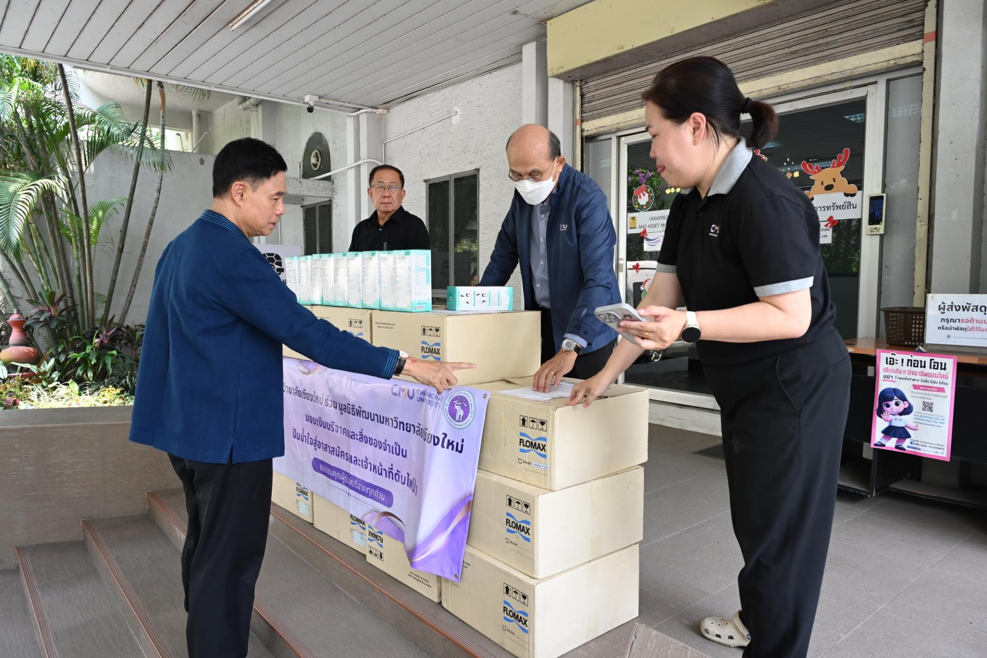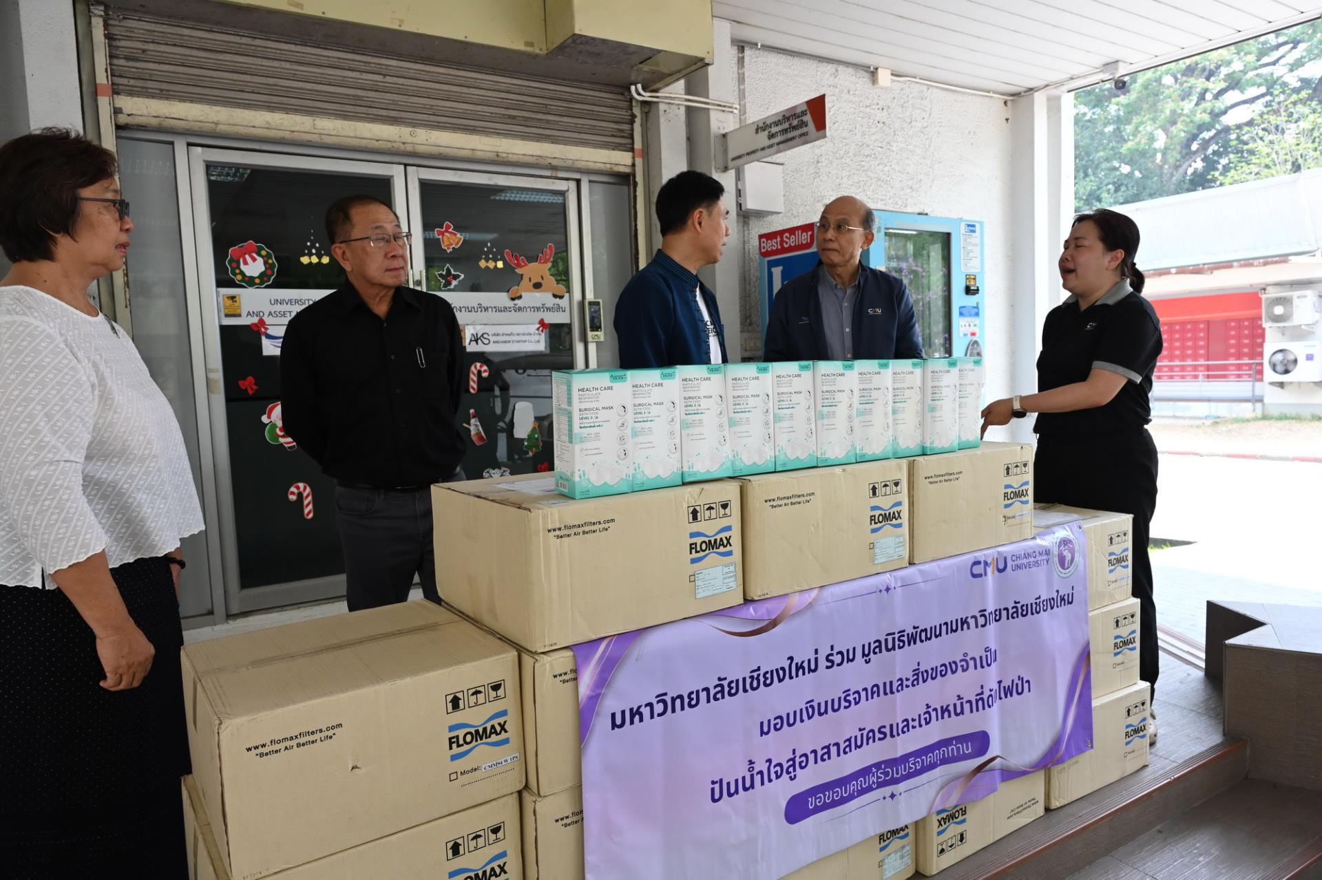 ศาสตราจารย์ ดร.นพ.พงษ์รักษ์ ศรีบัณฑิตมงคล อธิการบดี พร้อมด้วยคณะผู้บริหารมหาวิทยาลัยเชียงใหม่ และมูลนิธิพัฒนามหาวิทยาลัยเชียงใหม่ รับมอบหน้ากากอนามัย N95 จำนวน 20 กล่องๆละ 600 ชิ้น รวม 12,000 ชิ้น จากมหาวิทยาลัยนวมินทราธิราช เพื่อสนับสนุนและช่วยเหลือการปฏิบัติงานของเจ้าหน้าที่ ในโครงการปันน้ำใจสู่อาสาสมัครและเจ้าหน้าที่ดับไฟป่า เพื่อบรรเทาสถานการณ์ปัญหาฝุ่นหมอกควัน PM 2.5 และไฟป่า ในเขตพื้นที่ภาคเหนือ ณ สำนักงานบริหารและจัดการทรัพย์สิน มหาวิทยาลัยเชียงใหม่ วันพุธที่ 8 เมษายน พ.ศ. 2569