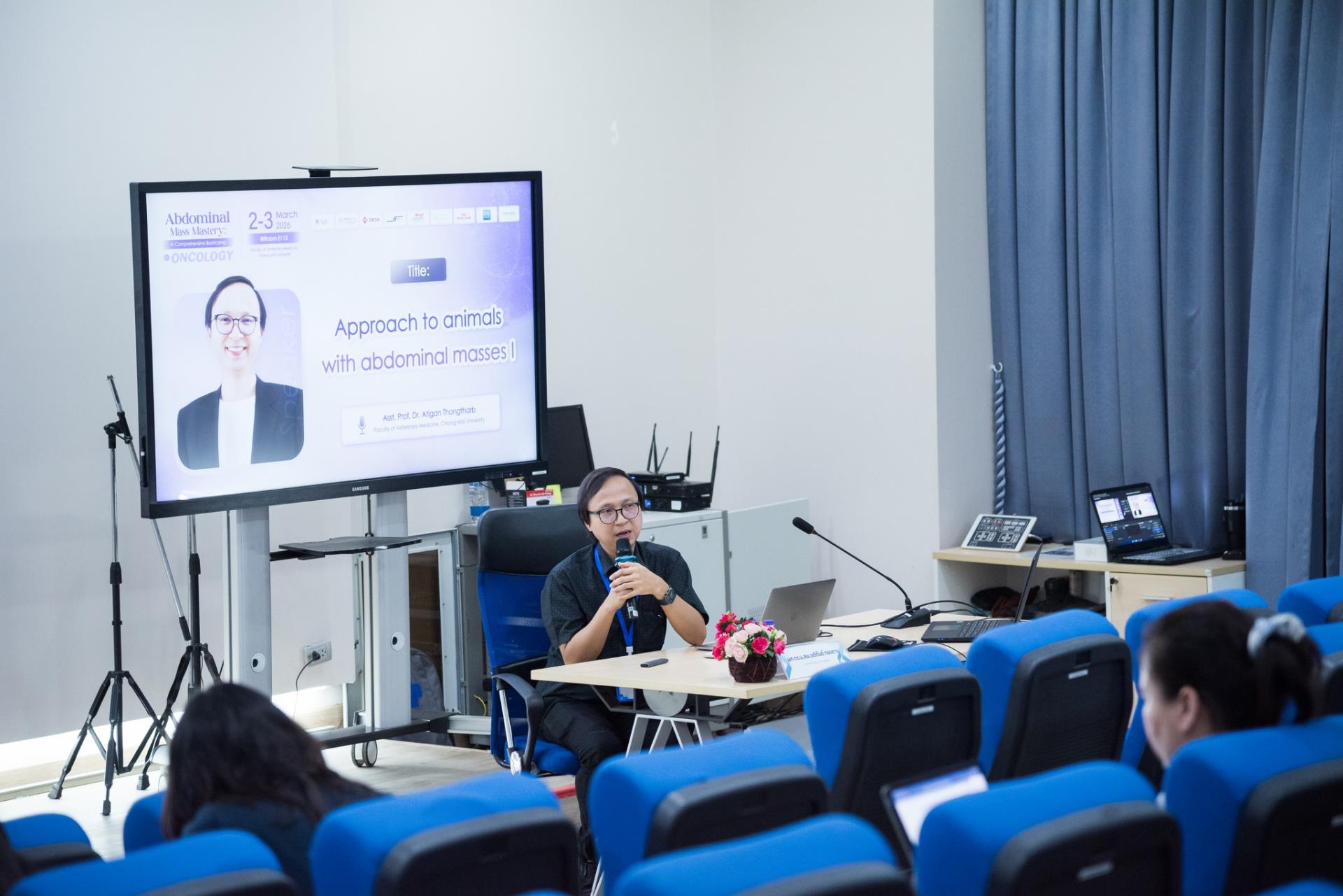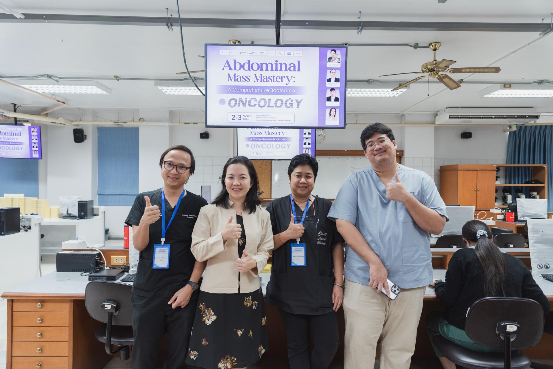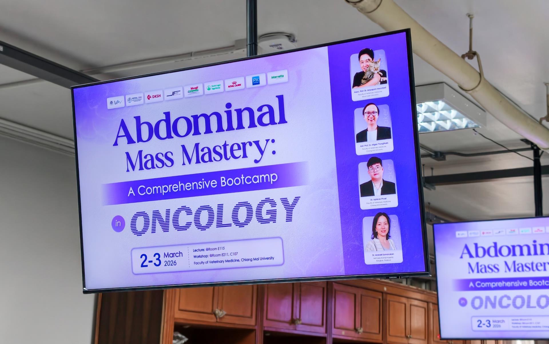 ศูนย์การศึกษาหลังปริญญา คณะสัตวแพทยศาสตร์ มหาวิทยาลัยเชียงใหม่ จัดโครงการอบรมเชิงปฏิบัติการหัวข้อ "Abdominal Mass Mastery: A Comprehensive Bootcamp in Oncology" ซึ่งจัดขึ้นระหว่างวันที่ 2 - 3 มีนาคม 2569 ณ คณะสัตวแพทยศาสตร์ มหาวิทยาลัยเชียงใหม่ โดยได้รับเกียรติจาก รองศาสตราจารย์ ดร. นายสัตวแพทย์ ภาณุวัฒน์ แย้มสกุล รองคณบดีคณะสัตวแพทยศาสตร์ มหาวิทยาลัยเชียงใหม่ เป็นประธานในพิธีเปิดโครงการ และ ผู้ช่วยศาสตราจารย์ ดร. นายสัตวแพทย์ อติกันต์ ทองทาบ รองคณบดีฝ่ายศูนย์ความเป็นเลิศทางคลินิกและการศึกษาหลังปริญญา เป็นผู้กล่าวรายงานวัตถุประสงค์การจัดงาน