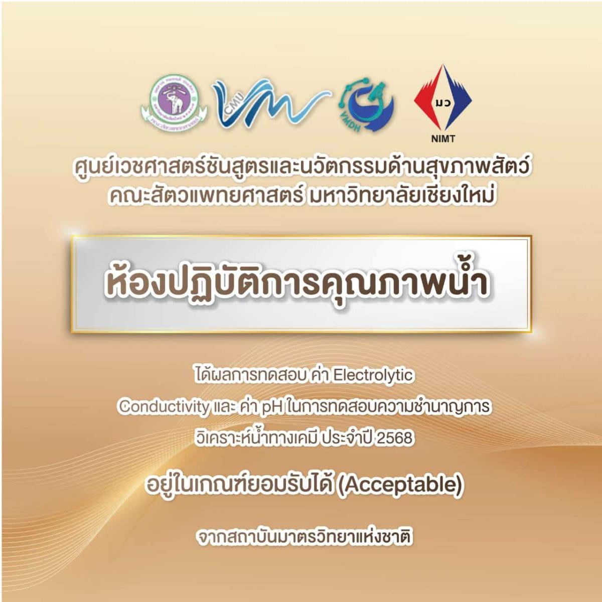 ห้องปฏิบัติการคุณภาพน้ำ ศูนย์เวชศาสตร์ชันสูตรและนวัตกรรมด้านสุขภาพสัตว์ ได้ผลการทดสอบ ค่า Electrolytic Conductivity และ ค่า pH ในการทดสอบความชำนาญการวิเคราะห์น้ำ ทางเคมี ประจำปี 2568 อยู่ในเกณฑ์ยอมรับได้ (Acceptable) จากสถาบันมาตรวิทยาแห่งชาติ