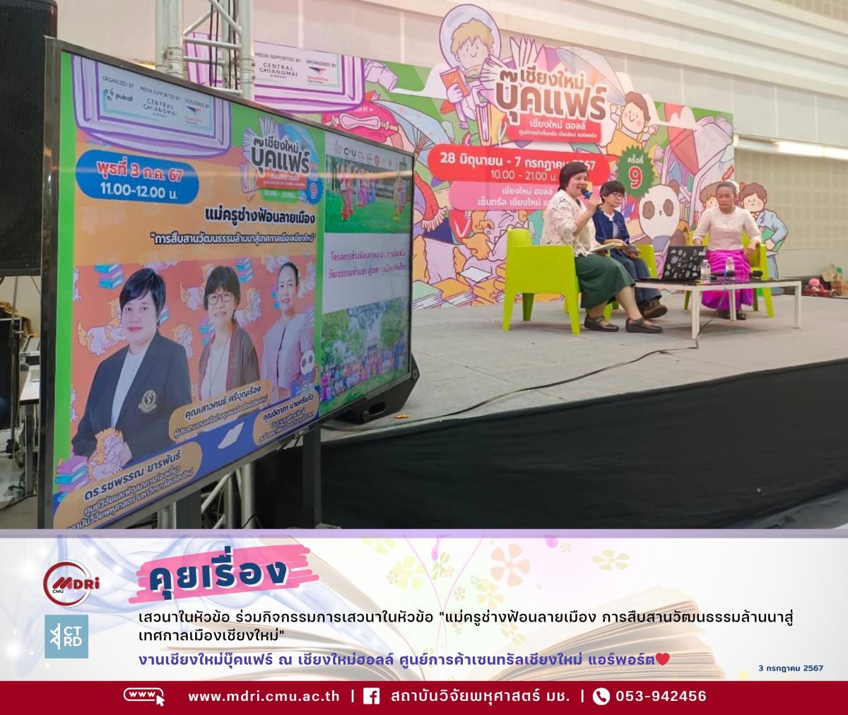 เมื่อวันที่ 3 กรกฎาคม พ.ศ. 2567 เวลา 11.00 - 12.00 น. ดร.รชพรรณ ฆารพันธ์ นักวิจัยชำนาญการพิเศษ ศูนย์วิจัยและพัฒนาการท่องเที่ยว สถาบันวิจัยพหุศาสตร์ มหาวิทยาลัยเชียงใหม่ ร่วมกับ คุณเสาวคนธ์ ศรีบุญเรือง ผู้ประสานงานเครือข่ายชุมชนเมืองรักษ์เชียงใหม่ และคุณจิดาภา นามศรีแก้ว ประธานศูนย์การเรียนรู้ภูมิปัญญาฟ้อนเมืองบ้านครูเอจิดาภา ร่วมกิจกรรมการเสวนาในหัวข้อ "แม่ครูช่างฟ้อนลายเมือง การสืบสานวัฒนธรรมล้านนาสู่เทศกาลเมืองเชียงใหม่" ในงานเชียงใหม่บุ๊คแฟร์ ในช่วง Education Talk ณ เชียงใหม่ฮอลล์ ศูนย์การค้าเซนทรัลชียงใหม่ แอร์พอร์ต โดยได้นำเสนอกิจกรรมการอบรมแม่ครูช่างฟ้อนลายเมือง ของโครงการช่างฟ้อนลายงาม : การส่งเสริมวัฒนธรรมล้านนาสู่เทศกาลเมืองเชียงใหม่ ซึ่งเป็นโครงการย่อยภายใต้โครงการ Creative Lanna Co-Communication กิจกรรมสร้างสรรค์อย่างยั่งยืน ของสำนักส่งเสริมศิลปวัฒนธรรมและล้านนาสร้างสรรค์ มหาวิทยาลัยเชียงใหม่