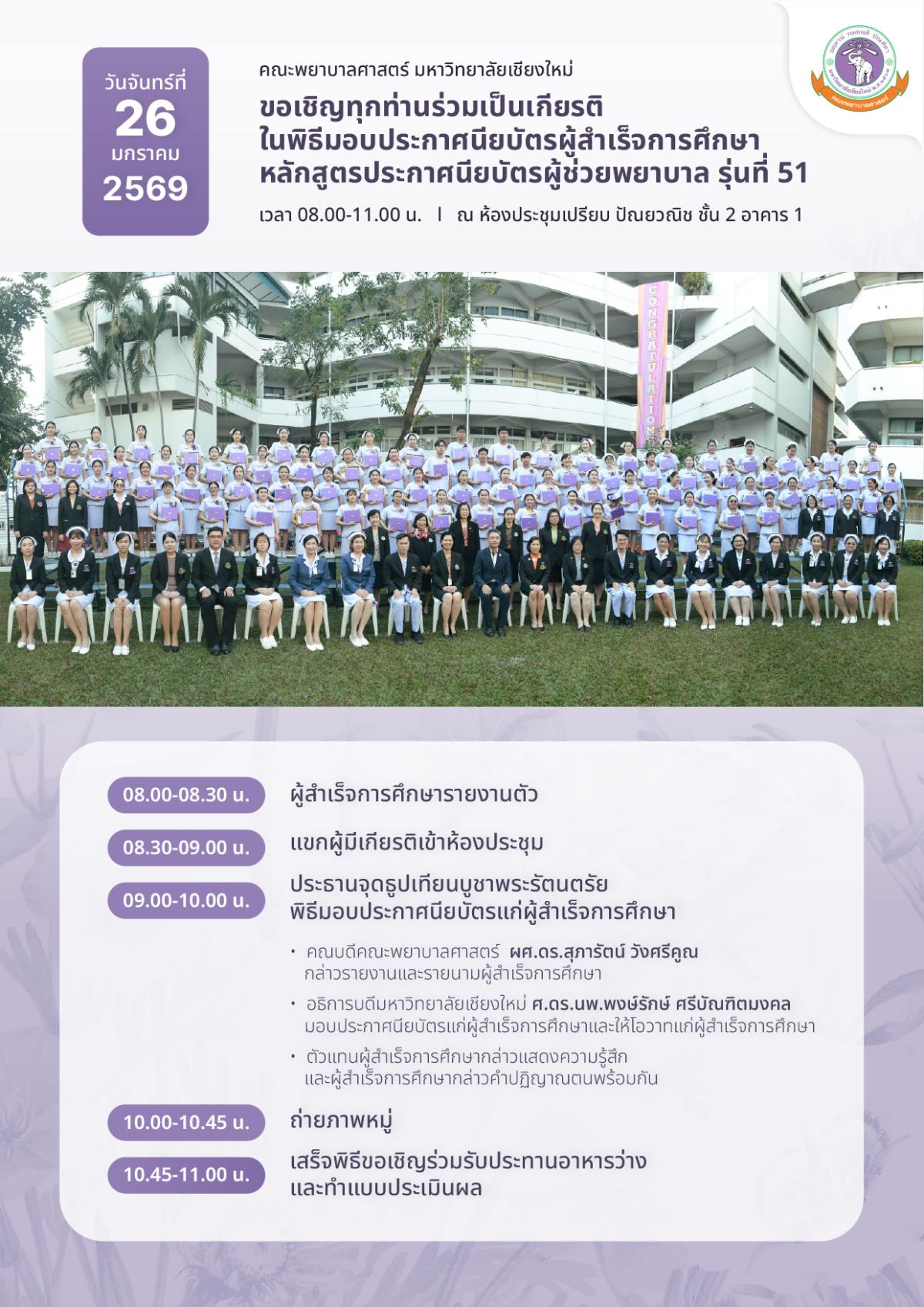 ขอเชิญทุกท่านร่วมเป็นเกียรติในพิธีมอบประกาศนียบัตรผู้สำเร็จการศึกษาหลักสูตรประกาศนียบัตรผู้ช่วยพยาบาล (รุ่นที่ 51)