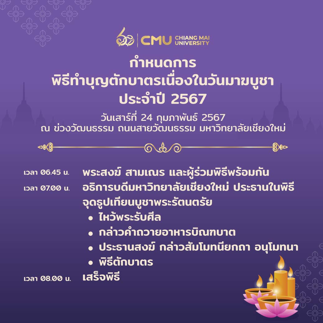 มหาวิทยาลัยเชียงใหม่ ขอเชิญชวนพุทธศาสนิกชนทุกท่าน ร่วมทำบุญตักบาตร เนื่องในวันมาฆบูชา ประจำปี 2567