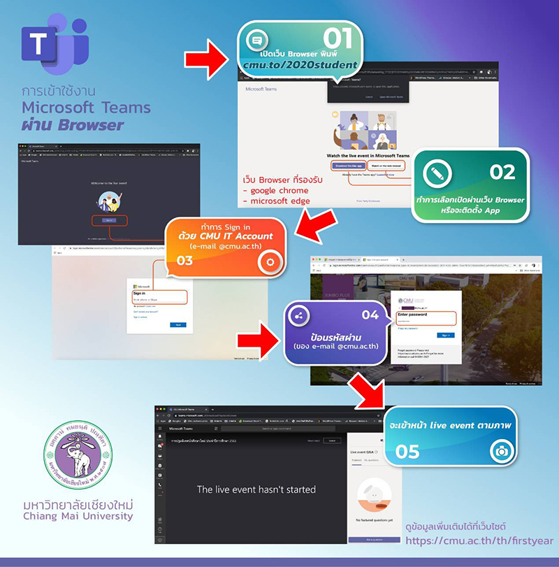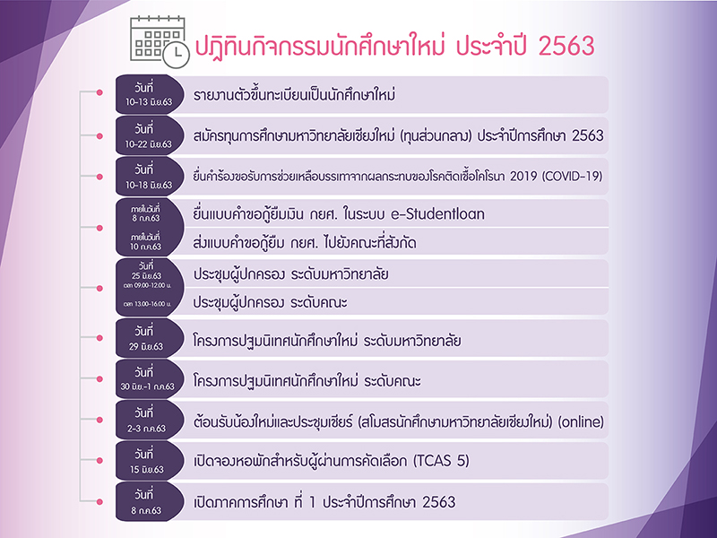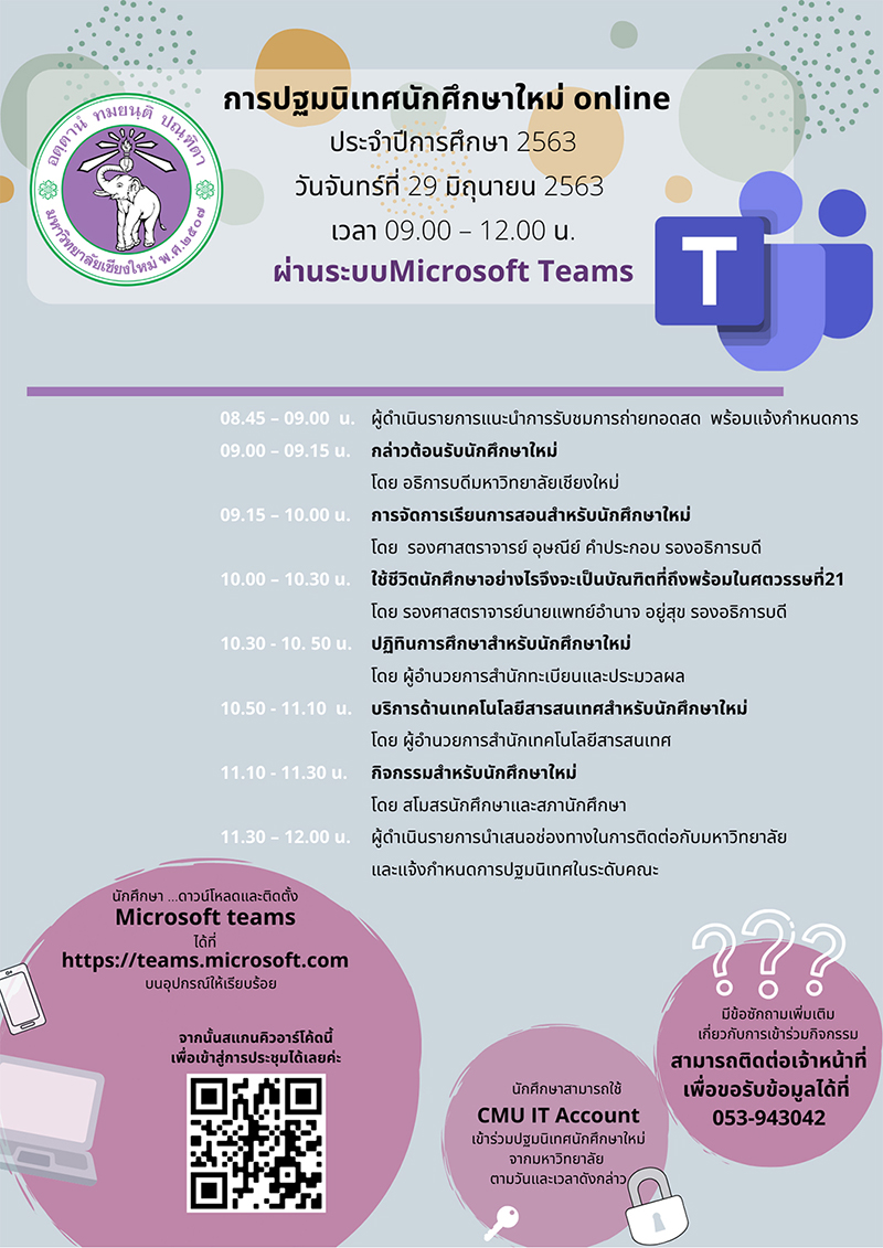 มหาวิทยาลัยเชียงใหม่ จัดปฐมนิเทศออนไลน์ สำหรับนักศึกษาใหม่ ประจำปีการศึกษา 2563 แนะแนวทางที่เป็นประโยชน์ต่อการศึกษา บริการ สวัสดิการ การปรับตัว การใช้ชีวิตในรั้วมหาวิทยาลัยอย่างมีความสุข ในวันที่ 29 มิถุนายน 2563 เวลา 08.45 – 12.00 น. ผ่านระบบ Microsoft Teams