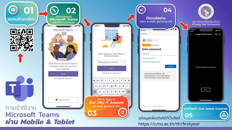 ขั้นตอนการเข้าร่วมปฐมนิเทศนักศึกษาใหม่ 2563 แบบออนไลน์นั้น นักศึกษาสามารถดาวน์โหลดและติดตั้ง Microsoft teams ได้ที่ https://teams.microsoft.com บนอุปกรณ์ให้เรียบร้อย จากนั้นสแกน QR Code นี้เพื่อเข้าสู่การประชุม โดยนักศึกษาสามารถใช้ CMU Account เพื่อเข้าร่วมปฐมนิเทศนักศึกษาใหม่จากมหาวิทยาลัยตามวันและเวลาดังกล่าว