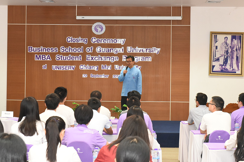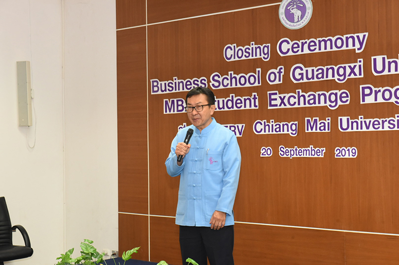 รองศาสตราจารย์โรม จิรานุกรม รองอธิการบดีมหาวิทยาลัยเชียงใหม่ ประธานในพิธีปิดและมอบวุฒิบัตร โครงการ GXU-CMU MBA Exchange Program 2019 ซึ่งผู้เข้าร่วมโครงการเป็นนักศึกษาจาก Business school of Guangxi University สาธารณรัฐประชาชนจีน เมื่อวันศุกร์ที่ 20 กันยายน พ.ศ.2562 ณ ห้องประชุมบัวตอง สำนักบริการวิชาการ มหาวิทยาลัยเชียงใหม่