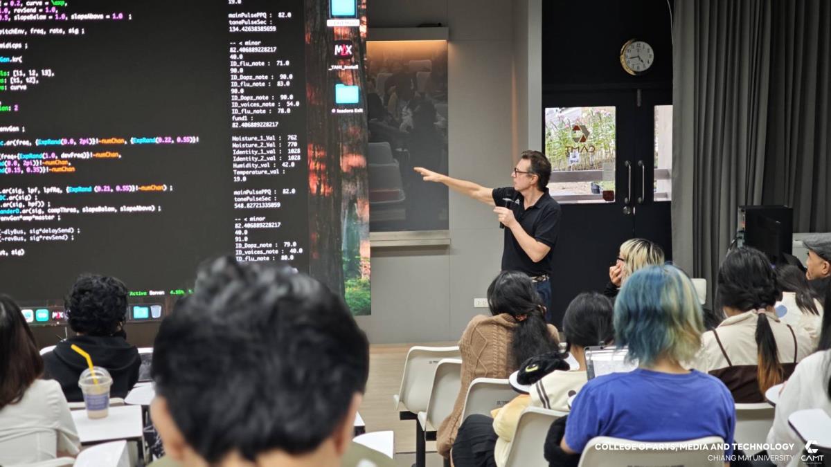 โดยหัวใจสำคัญของงานคือการบรรยายโดย Riccardo Mazza ศิลปินและนักสร้างสรรค์เสียงชื่อดังชาวอิตาลี ผู้เชี่ยวชาญการผสมผสานศิลปะเข้ากับระบบนิเวศ ผ่านผลงานสุดล้ำ "Exit Music — When Nature Becomes Orchestra" โดยการใช้เซนเซอร์ตรวจวัดกิจกรรมทางชีวภาพของพืช (แสง, ความชื้น, อุณหภูมิ) แปลงข้อมูลจากสิ่งมีชีวิตให้กลายเป็นบทเพลงแบบ Real-time ผ่านอัลกอริทึมและไลฟ์อิเล็กทรอนิกส์ พานักศึกษาเปิดมุมมองใหม่ เปลี่ยนเสียงที่ "มองไม่เห็น" ของธรรมชาติ ให้กลายเป็นงานศิลปะที่สัมผัสได้ด้วยการฟัง