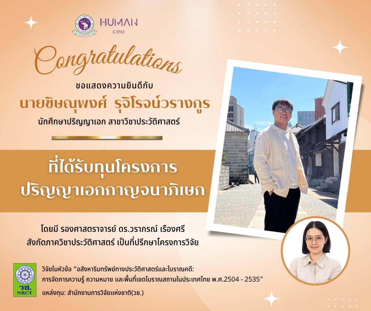 นายชิษณุพงศ์ รุจิโรจน์วรางกูร นักศึกษาปริญญาเอก สาขาวิชาประวัติศาสตร์ คณะมนุษยศาสตร์ มหาวิทยาลัยเชียงใหม่ ได้รับทุนโครงการปริญญาเอกกาญจนาภิเษกในหัวข้อ “อสังหาริมทรัพย์ทางประวัติศาสตร์และโบราณคดี: การจัดการความรู้ ความหมาย และพื้นที่เขตโบราณสถานในประเทศไทยพ.ศ.2504 - 2535” โดยมี รองศาสตราจารย์ ดร.วราภรณ์ เรืองศรี สังกัด ภาควิชาประวัติศาสตร์ คณะมนุษยศาสตร์ มหาวิทยาลัยเชียงใหม่ เป็นที่ปรึกษาโครงการวิจัย