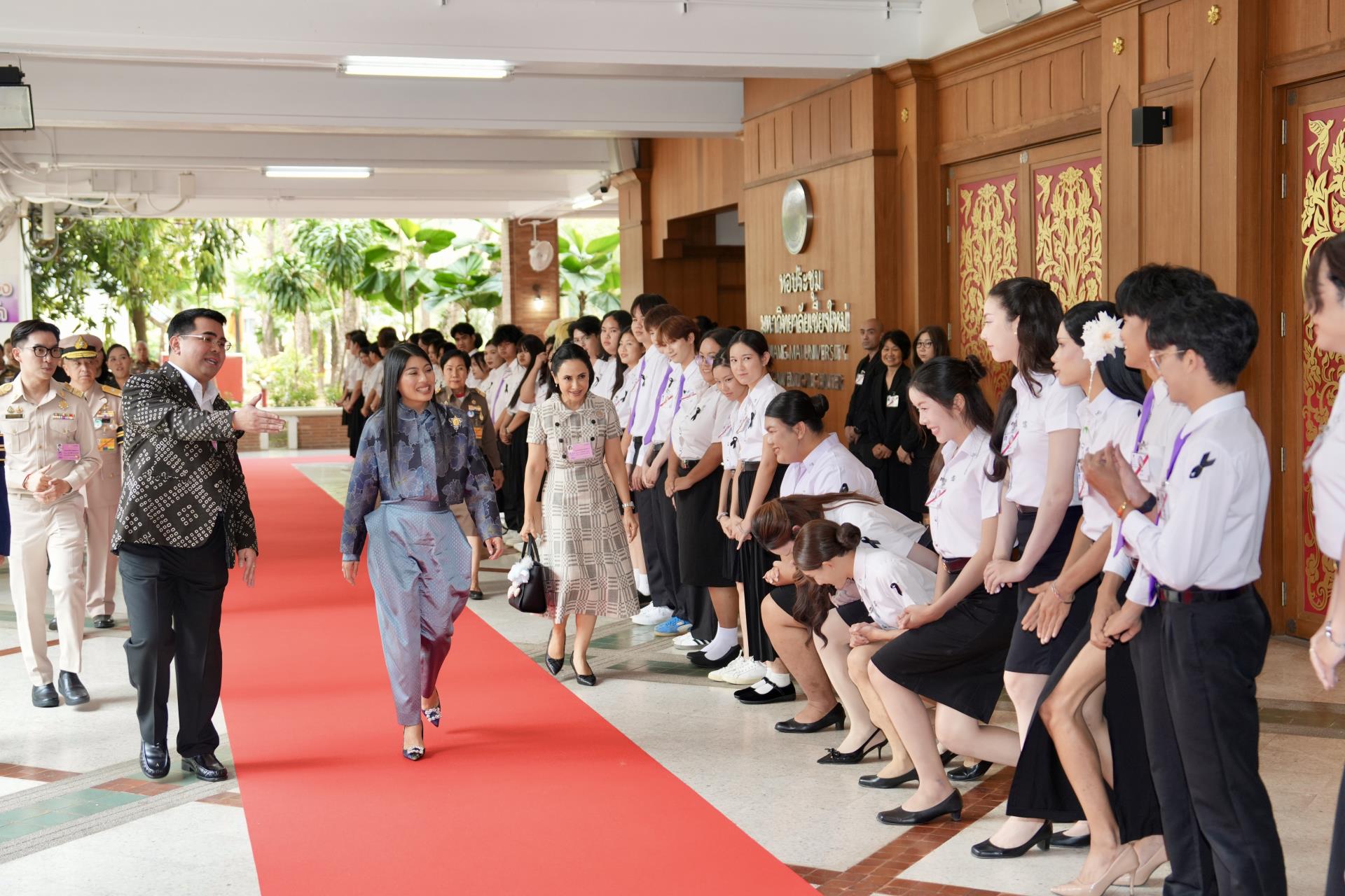 สมเด็จพระเจ้าลูกเธอ เจ้าฟ้าสิริวัณณวรี นารีรัตนราชกัญญา เสด็จทอดพระเนตรนิทรรศการและการจัดแสดงผลงานภูมิปัญญาผ้าไทย และงานหัตถกรรมชุมชนภาคเหนือ ณ หอประชุมมหาวิทยาลัยเชียงใหม่ จ.เชียงใหม่ เมื่อวันศุกร์ที่ 6 มีนาคม 2569 ในการนี้ ศ.ปฏิบัติ ดร.เอกชัย มหาเอก รองอธิการบดี มหาวิทยาลัยเชียงใหม่ พร้อมด้วยคณะผู้บริหาร คณาจารย์ และนักศึกษา เฝ้ารับเสด็จ