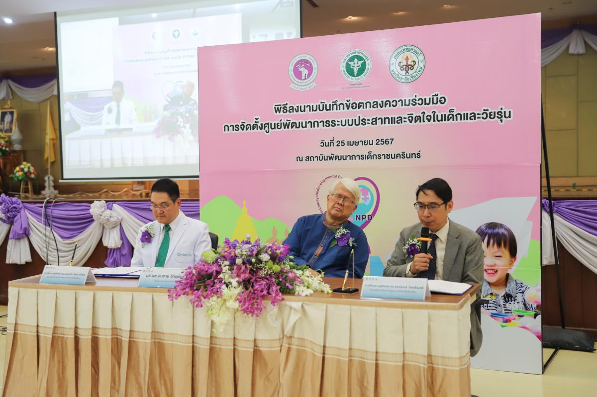 ศ.(เชี่ยวชาญพิเศษ) ดร.ธรณินทร์ ไชยเรืองศรี คณบดีคณะวิทยาศาสตร์ ร่วมเป็นเกียรติในพิธีเปิดศูนย์พัฒนาการระบบประสาทและจิตใจในเด็กและวัยรุ่น (NPD Center) และลงนามความร่วมมือการจัดตั้งศูนย์พัฒนาการระบบประสาทและจิตใจในเด็กและวัยรุ่น ร่วมกับ นพ.มล.สมชาย จักรพันธุ์ ที่ปรึกษากรมสุขภาพจิต และ ศ.(เชี่ยวชาญพิเศษ) นพ.บรรณกิจ โลจนาภิวัฒน์ คณบดีคณะแพทยศาสตร์ มหาวิทยาลัยเชียงใหม่ ตลอดจนผู้บริหารที่เกี่ยวข้อง ในวันที่ 25 เมษายน 2567 ณ ห้องประชุมชั้น 4 อาคารเทพรัตนราชสุดา สถาบันพัฒนาการเด็กราชนครินทร์ เพื่อร่วมกันบูรณาการองค์ความรู้และความร่วมมือทางด้านประสาทวิทยาศาสตร์ เพื่อความเป็นเลิศในการให้บริการตรวจวินิจฉัย และบำบัดรักษานกลุ่มผู้ป่วยเด็กและวัยรุ่นที่มีความผิดปกติด้านระบบประสาทและพัฒนาการ