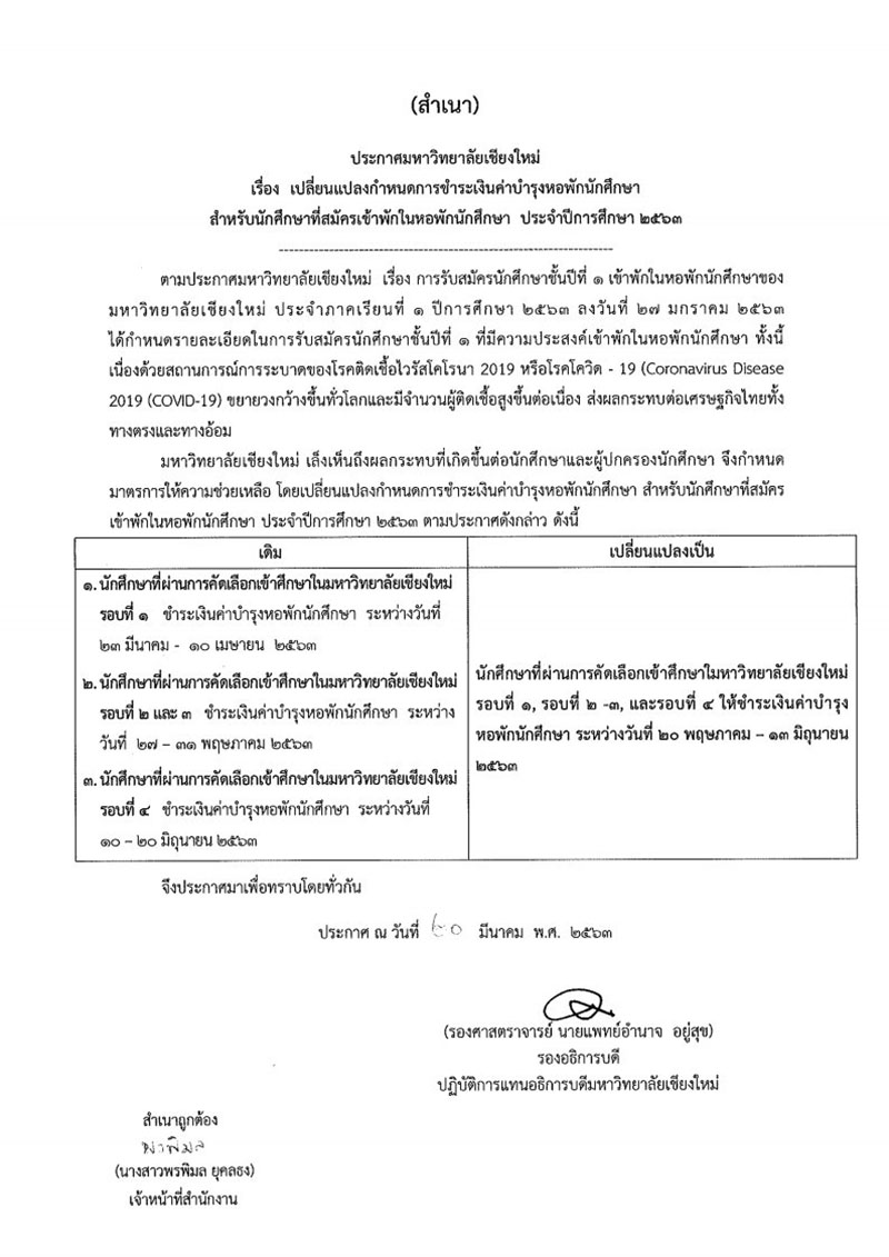 สำนักงานหอพักนักศึกษา มหาวิทยาฃัยเชียงใหม่ เล็งเห็นผลกระทบต่อนักศึกษาและผู้ปกครอง จากสถานการณ์ การแพร่ระบาด ของเชื้อไวรัส โควิด- 19 จึงได้กำหนดเปลี่ยนแปลงการชำระเงินค่าบำรุงหอพักนักศึกษา สำหรับนักศึกษาที่สมัครเข้าพัก ประจำปีการศึกษา 2563