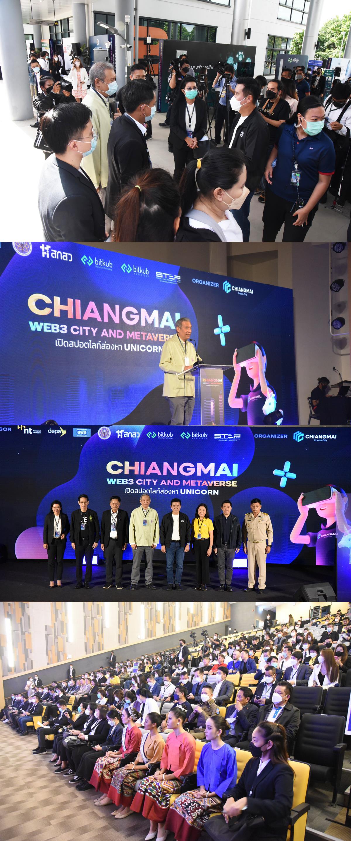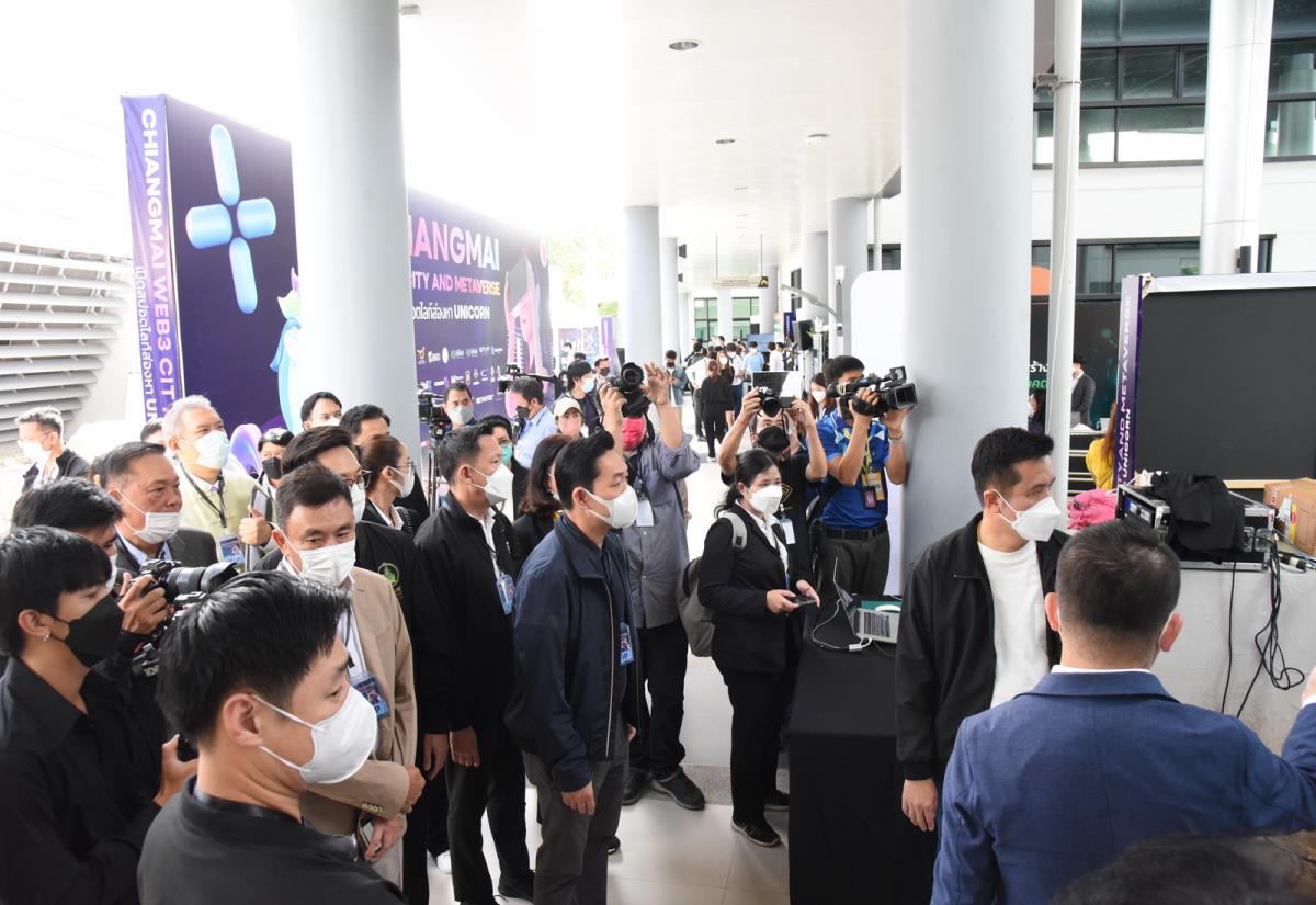 ผู้ช่วยศาสตราจารย์ ดร.ณัฐ วรยศ รองอธิการบดีผู้แทนอธิการบดีมหาวิทยาลัยเชียงใหม่ ร่วมให้การต้อนรับ นายชัยวุฒิ ธนาคมานุสรณ์ รัฐมนตรีกระทรวงดิจิทัลเพื่อเศรษฐกิจและสังคม ในโอกาสที่มาเป็นประธานในโครงการ Chiangmai Web3 City and Metaverse เปิดสปอตไลต์ส่องหา UNICORN โดยมี ดร.กิตติ สัจจานนท์ ผู้อำนวยการหน่วยบริหารจัดการทุนด้านการพัฒนาระดับพื้นที่ (บพท.) กล่าวรายงานวัตถุประสงค์ในการจัดงาน โครงการ Chiangmai Web3 City and Metaverse เปิดสปอตไลต์ส่องหา UNICORN เพื่อสนับสนุนความก้าวหน้าในการพัฒนาเศรษฐกิจและการบริหารระดับเมืองด้วยดิจิทัล ซึ่งประกอบด้วยกิจกรรมสัมมนาและการเสวนา การจัดแสงนิทรรศการจากองค์กรต่างๆ กิจกรรมการจับค่ธุรกิจ และการนำเสนอแผนธุรกิจ จัดขึ้นระหว่างวันที่ 29 – 30 มิถุนายน 2565 ณ NSP Rice Grain Auditorium อาคารอำนวยการอุทยานวิทยาศาสตร์ภาคเหนือ (จ.เชียงใหม่)