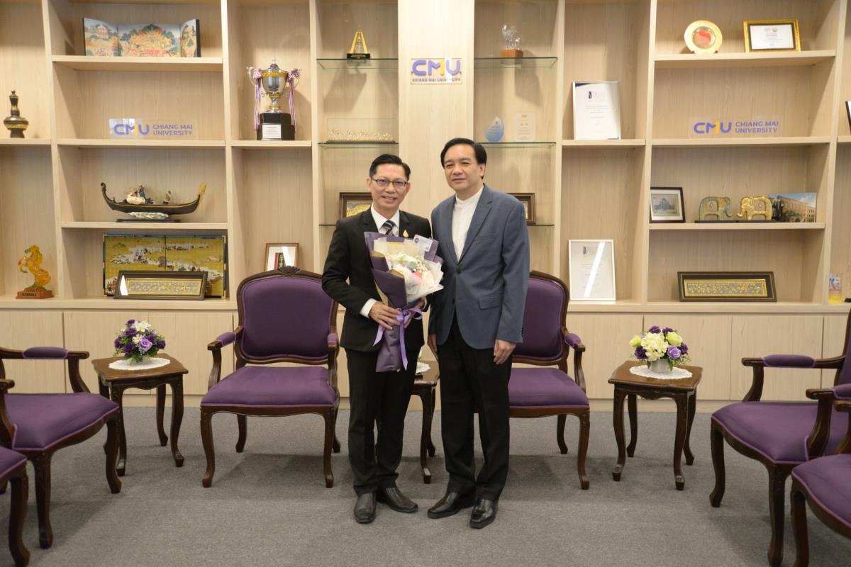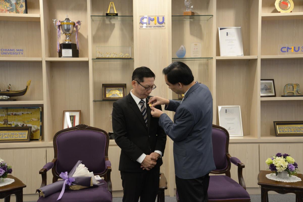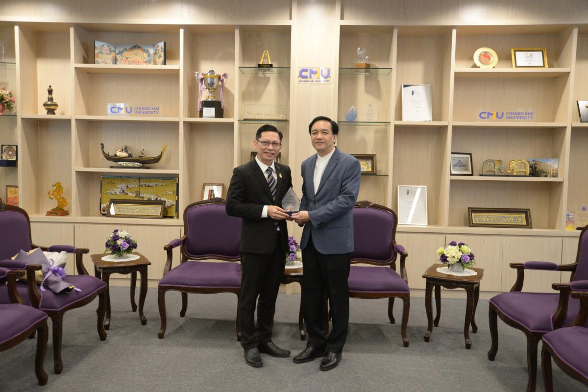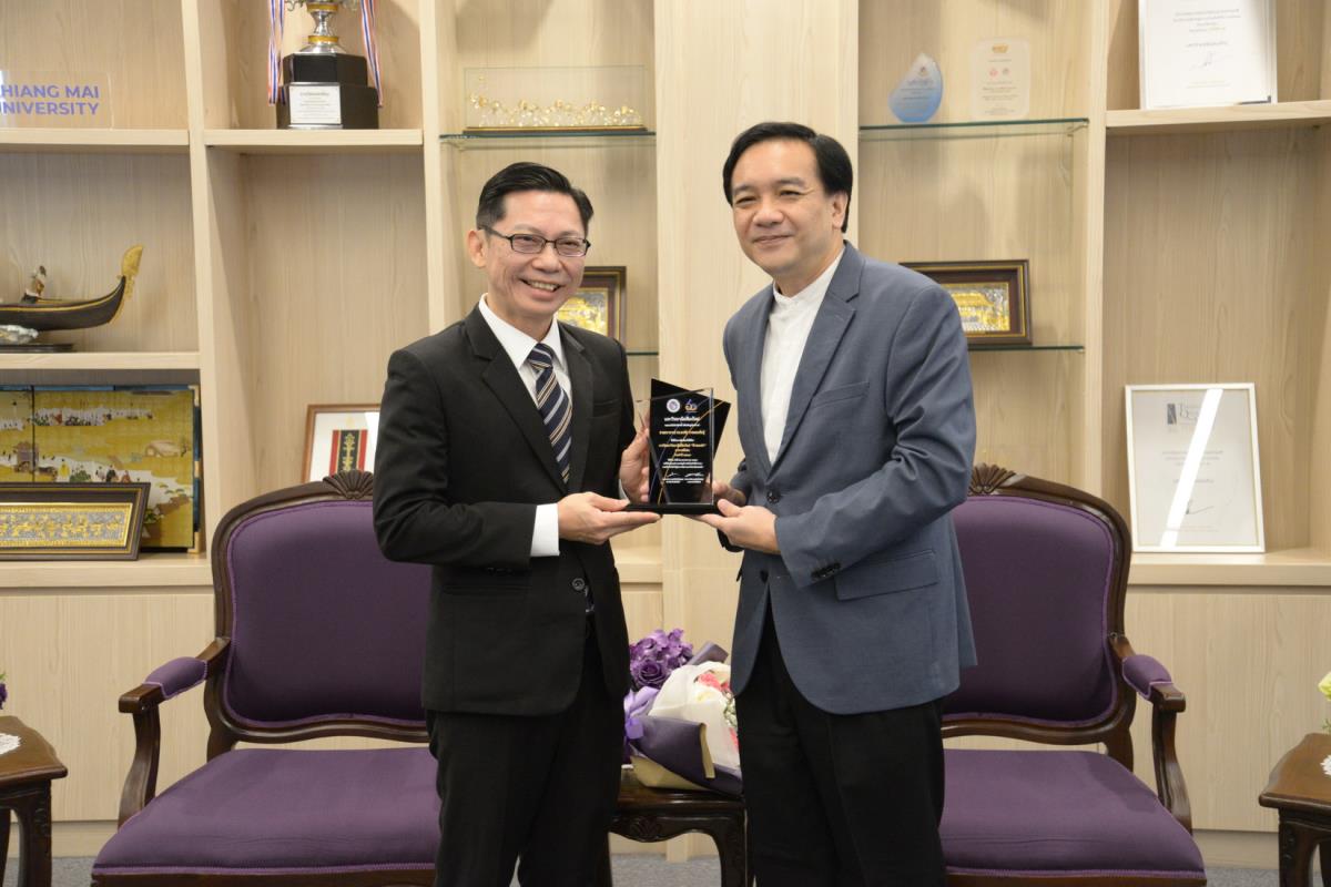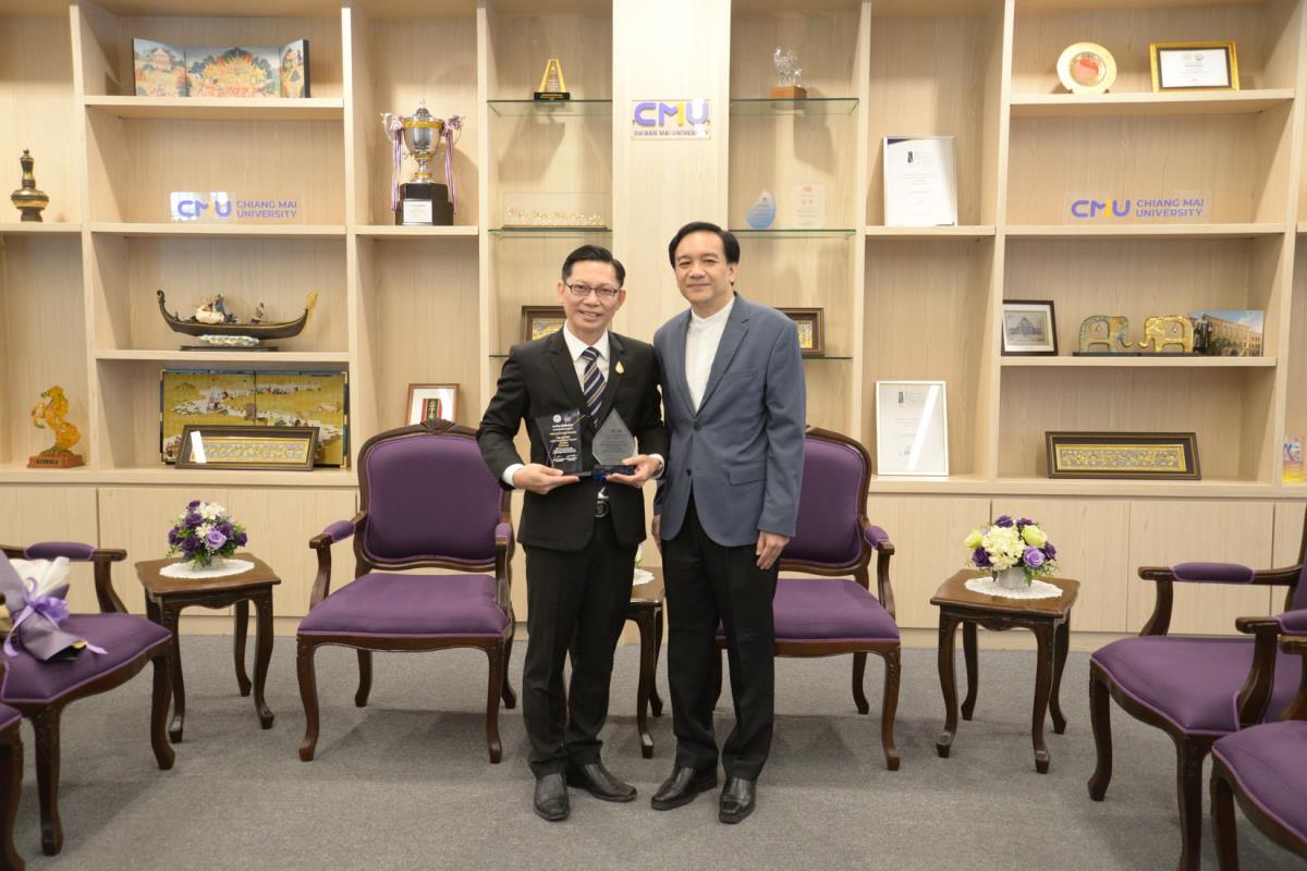 ศาสตราจารย์ปฏิบัติ ดร.ชรินทร์ เตชะพันธุ์ รองอธิการบดี ผู้แทนอธิการบดีมหาวิทยาลัยเชียงใหม่ มอบรางวัลมหาวิทยาลัยเชียงใหม่ “ช้างทองคำ” ประจำปี 2567 รางวัลรางวัลอาจารย์ดีเด่น สาขาวิชาวิทยาศาสตร์และเทคโนโลยี แด่ ศาสตราจารย์ ดร. พรชัย ราชตนะพันธุ์ คณะอุตสาหกรรมเกษตร มหาวิทยาลัยเชียงใหม่ ณ ห้องรับรอง มล.ปิ่น มาลากุล อาคารสำนักงานมหาวิทยาลัย 1 มหาวิทยาลัยเชียงใหม่ วันพฤหัสบดีที่ 13 กุมภาพันธ์ พ.ศ. 2568
