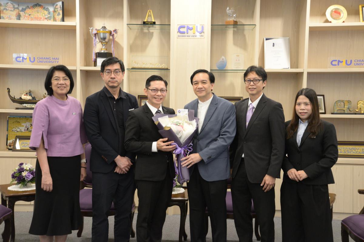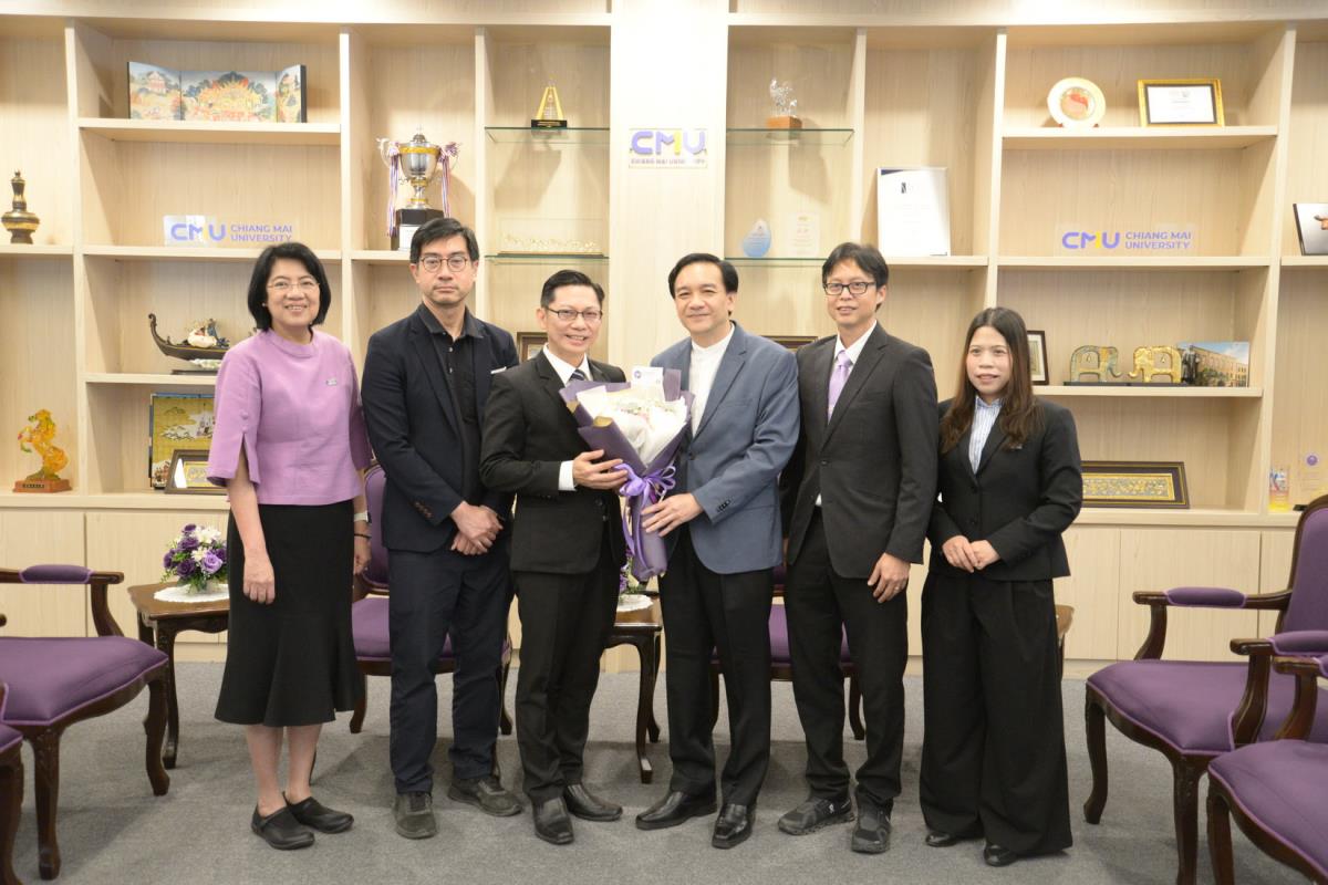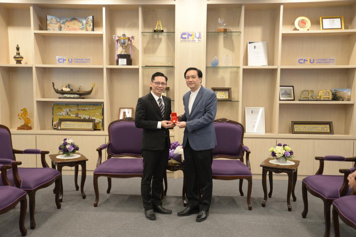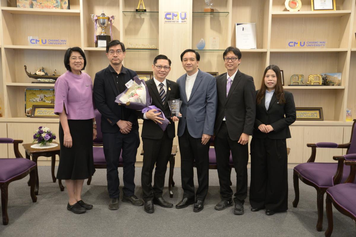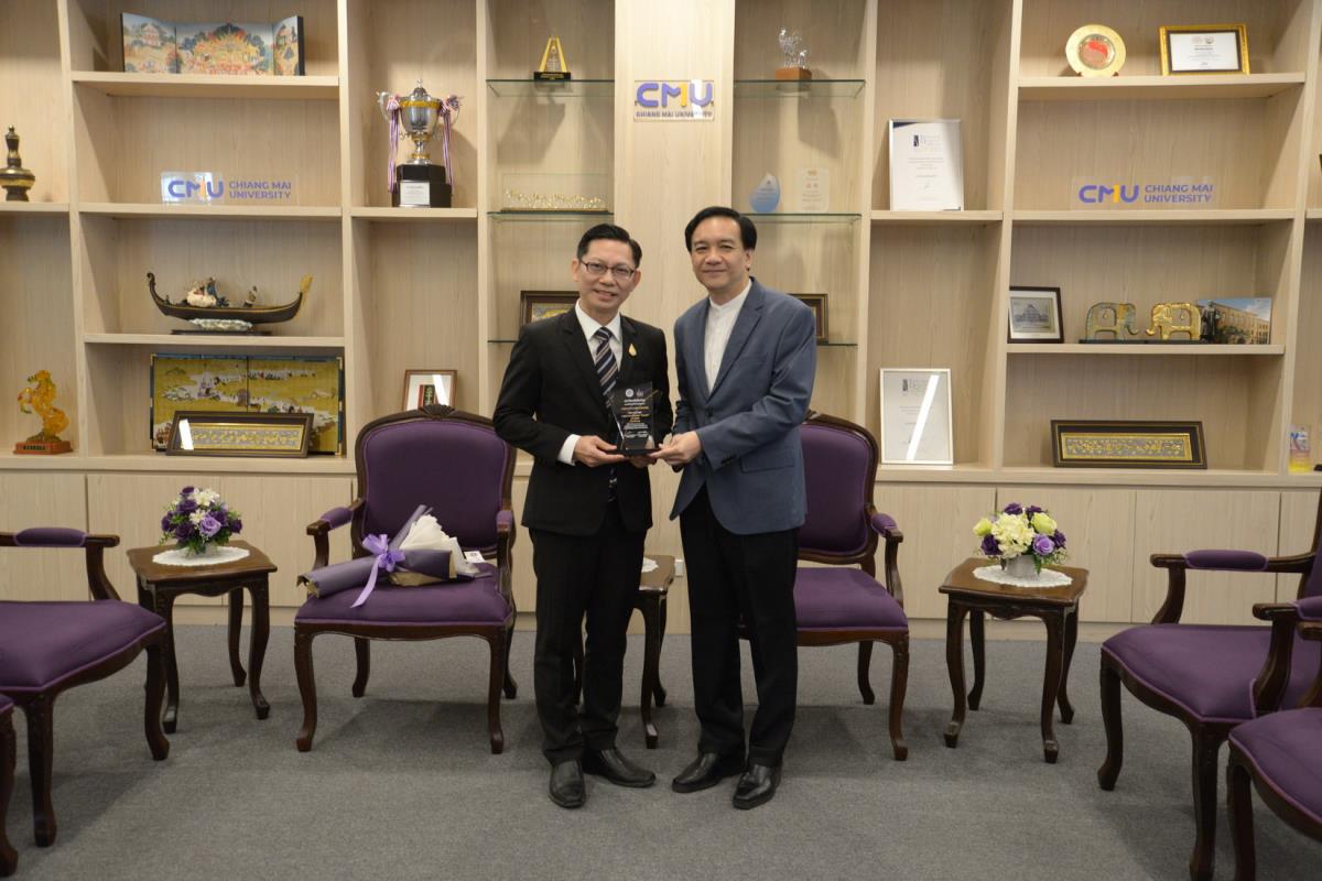 ศาสตราจารย์ปฏิบัติ ดร.ชรินทร์ เตชะพันธุ์ รองอธิการบดี ผู้แทนอธิการบดีมหาวิทยาลัยเชียงใหม่ มอบรางวัลมหาวิทยาลัยเชียงใหม่ “ช้างทองคำ” ประจำปี 2567 รางวัลรางวัลอาจารย์ดีเด่น สาขาวิชาวิทยาศาสตร์และเทคโนโลยี แด่ ศาสตราจารย์ ดร. พรชัย ราชตนะพันธุ์ คณะอุตสาหกรรมเกษตร มหาวิทยาลัยเชียงใหม่ ณ ห้องรับรอง มล.ปิ่น มาลากุล อาคารสำนักงานมหาวิทยาลัย 1 มหาวิทยาลัยเชียงใหม่ วันพฤหัสบดีที่ 13 กุมภาพันธ์ พ.ศ. 2568