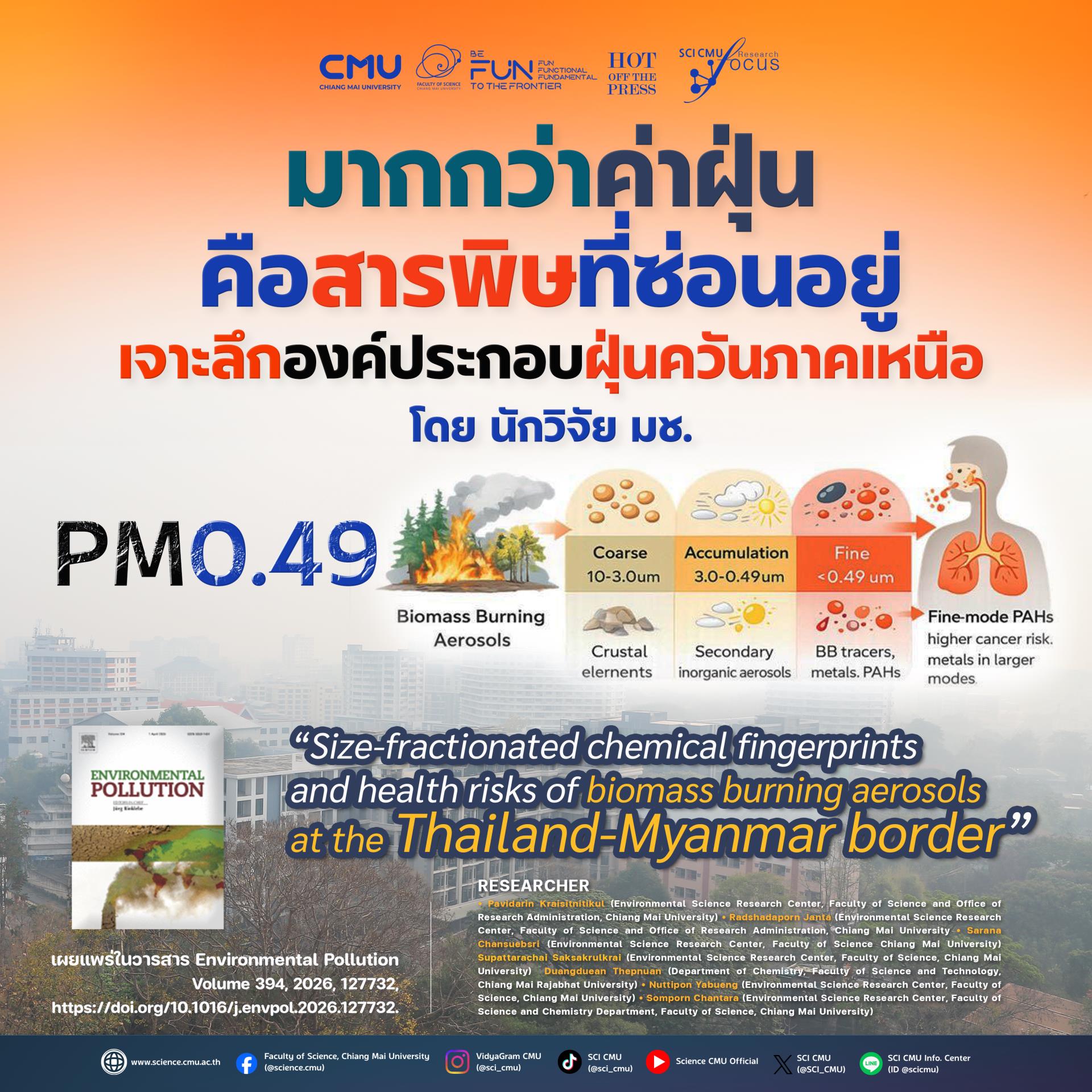 หมอกควันภาคเหนือจึงไม่ใช่เพียงปัญหาสิ่งแวดล้อม แต่เป็นปัญหาสุขภาพของประชาชน และเป็นปัญหาเชิงโครงสร้างที่เกี่ยวข้องกับการเกษตร การจัดการป่าไม้ เศรษฐกิจ และความร่วมมือระหว่างประเทศ สิ่งที่งานวิจัยนี้พยายามบอกเราคือ เราไม่ควรมองเพียงว่าฝุ่นมีปริมาณเท่าใด แต่ควรมองว่าในฝุ่นนั้นมีอะไรอยู่บ้าง เพราะสิ่งที่อันตรายที่สุดอาจไม่ใช่ตัวเลขค่าฝุ่นเพียงอย่างเดียว แต่อาจเป็น “สารพิษในฝุ่น” ที่เราหายใจเข้าไปทุกวันโดยไม่รู้ตัว