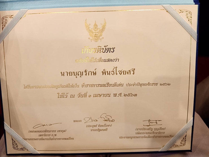 ดร.บุญรักษ์ พันธ์ไชยศรี ตำแหน่ง นักวิจัย ชำนาญการ สังกัดสถาบันวิจัยวิทยาศาตร์และเทคโนโลยี ได้รับการคัดเลือกให้เป็นข้าราชการพลเรือนดีเด่น ประจำปี พ.ศ. 2562 โดยได้รับเข็มเชิดชูเกียรติ (ครุฑทองคำ) และเกียรติบัตรเชิดชูเกียรติ ในวันข้าราชการพลเรือน ประจำปี พ.ศ.2562 ซึ่งจัดโดยคณะกรรมการจัดงานวันข้าราชการพลเรือน สำนักงาน ก.พ. เมื่อวันศุกร์ที่ 21 สิงหาคม2563 ณ ห้องประชุมภูมิบดินทร์ อาคารสถานศึกษาเคมีปฏิบัติ กรมวิทยาศาสตร์บริการ