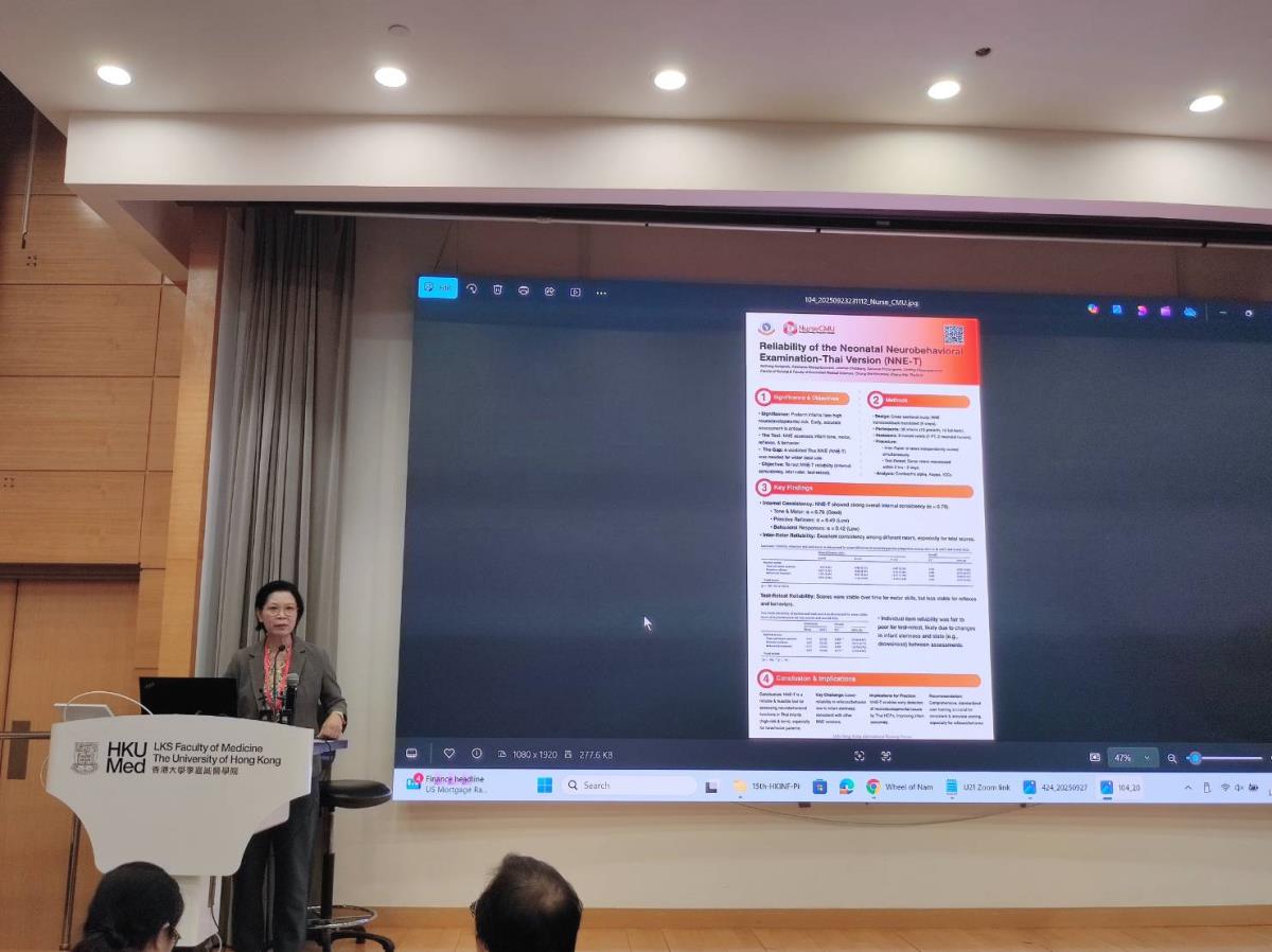 ในโอกาสนี้ ผู้ช่วยศาสตราจารย์ ดร.เนตรทอง นามพรม รองคณบดี คณะพยาบาลศาสตร์ มช. เข้าร่วมการประชุมในฐานะผู้แทนของคณะฯ และนำเสนอผลงานวิจัยในรูปแบบ Poster Presentation เรื่อง "Reliability of the Neonatal Neurobehavioral Examination-Thai Version"