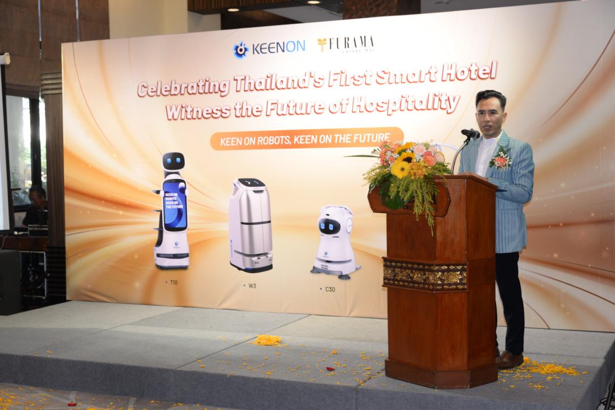 รองศาสตราจารย์ ดร.ปิยะพงศ์ เนียมทรัพย์ ผู้ช่วยอธิการบดีมหาวิทยาลัยเชียงใหม่ ร่วมพิธีเปิดตัวหุ่นยนต์ Keenon Robotic สำหรับธุรกิจโรงแรม โดยมี ดร.วัชระ ตันตรานนท์ ประธานกรรมการบริหาร โรงแรมฟูรามา กล่าวต้อนรับ นายวีรพงศ์ ฤทธิ์รอด รองผู้ว่าราชการจังหวัดเชียงใหม่ กล่าวแสดงความยินดี พร้อมด้วยผู้บริหาร ผู้แทนจากองค์กร หน่วยงานต่างๆ ร่วมงาน เพื่อเป็นจุดเริ่มยกระดับมาตรฐานการบริการโรงแรมของประเทศไทยเป็นแห่งแรกด้วย KEENON Robotics หุ่นยนต์อัจฉริยะที่ออกแบบมาเพื่อการส่งมอบสิ่งอำนวยความสะดวก ที่เข้าถึงการบริการลูกค้าผู้เข้าพักอย่างราบรื่นในทุกชั้นของโรงแรม ช่วยเพิ่มประสิทธิภาพในการส่งมอบ พร้อมมอบความปลอดภัยแบบไร้การสัมผัส เพื่อสร้างประสบการณ์ที่เหนือความคาดหมายและความพึงพอใจสูงสุดให้กับลูกค้าโรงแรมฟูราม่า เชียงใหม่ วันพฤหัสบดีที่ 20 กุมภาพันธ์ พ.ศ. 2568