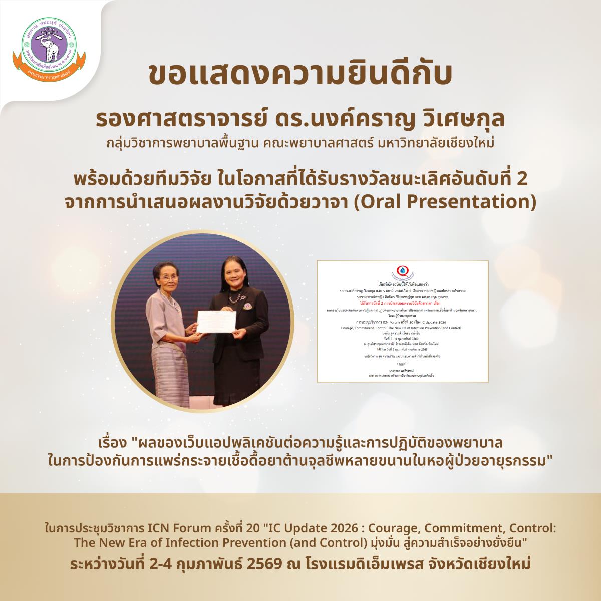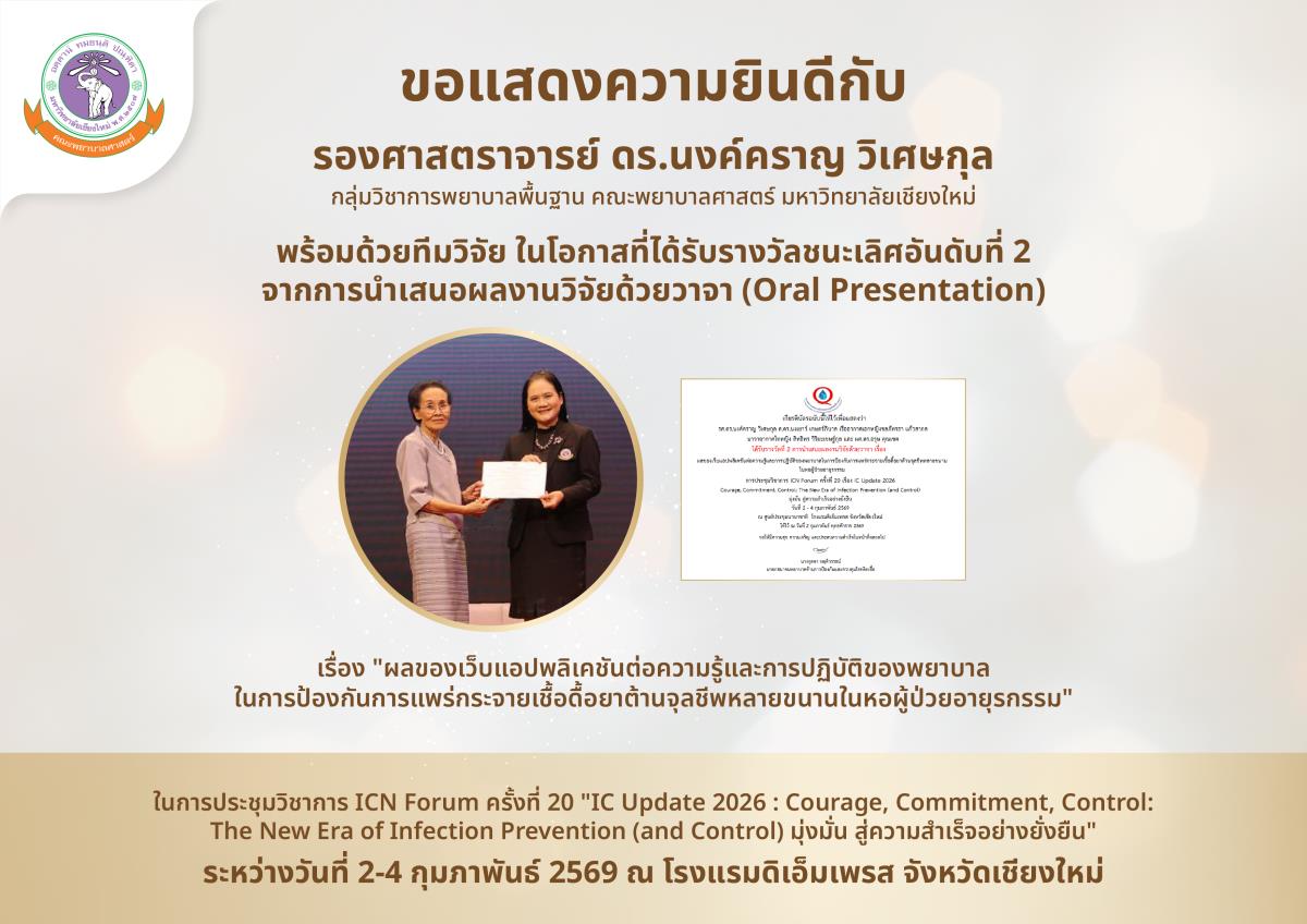 ขอแสดงความยินดีกับ รองศาสตราจารย์ ดร.นงค์คราญ วิเศษกุล กลุ่มวิชาการพยาบาลพื้นฐาน คณะพยาบาลศาสตร์ มหาวิทยาลัยเชียงใหม่ พร้อมด้วยทีมวิจัย ในโอกาสที่ได้รับรางวัลชนะเลิศอันดับที่ 2 จากการนำเสนอผลงานวิจัยด้วยวาจา (Oral Presentation) เรื่อง "ผลของเว็บแอปพลิเคชันต่อความรู้และการปฏิบัติของพยาบาลในการป้องกันการแพร่กระจายเชื้อดื้อยาต้านจุลชีพหลายขนานในหอผู้ป่วยอายุรกรรม" ในการประชุมวิชาการ ICN Forum ครั้งที่ 20 หัวข้อ "IC Update 2026 : Courage, Commitment, Control: The New Era of Infection Prevention (and Control) มุ่งมั่น สู่ความสำเร็จอย่างยั่งยืน" ระหว่างวันที่ 2-4 กุมภาพันธ์ 2569 ณ ศูนย์ประชุมนานาชาติ โรงแรมดิเอ็มเพรสจังหวัดเชียงใหม่