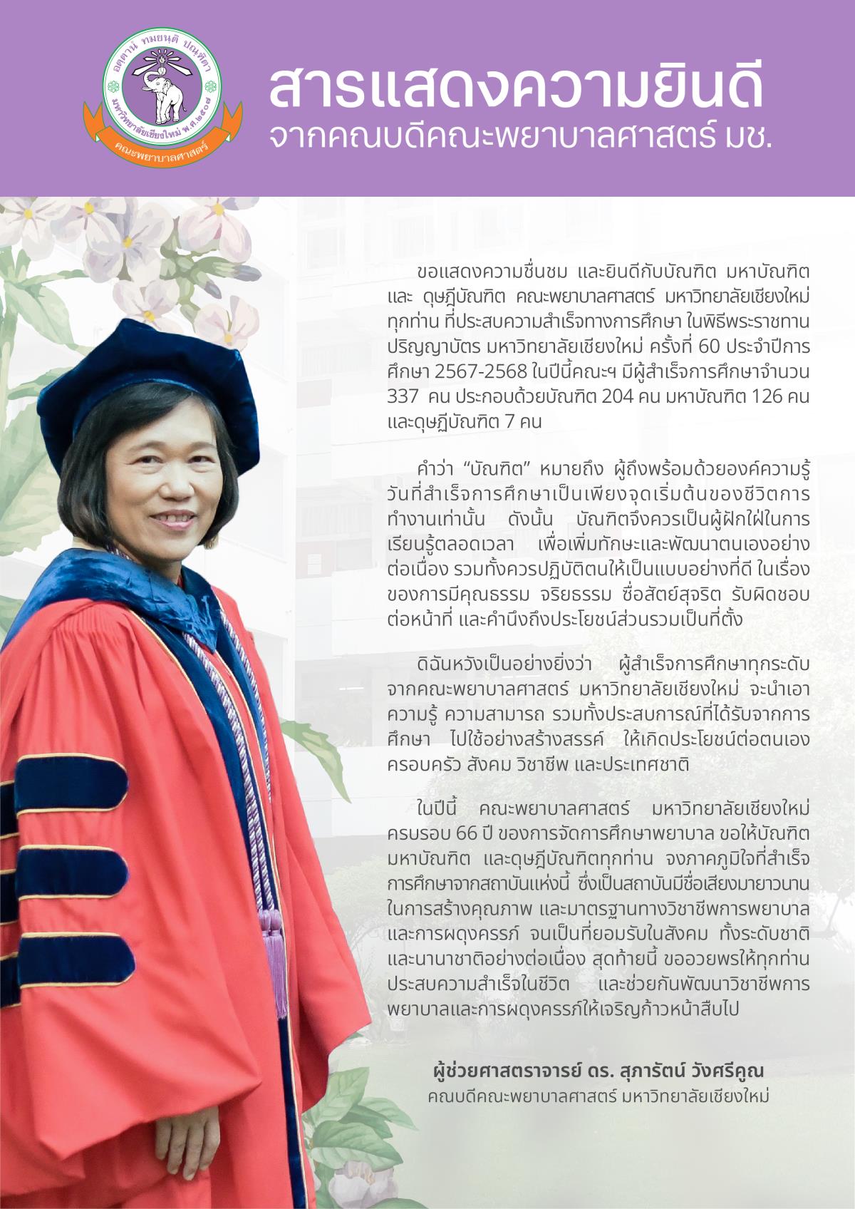 สารแสดงความยินดีจากคณบดีคณะพยาบาลศาสตร์ พิธีพระราชทานปริญญาบัตร มหาวิทยาลัยเชียงใหม่ ครั้งที่ 60 ประจำปีการศึกษา 2567-2568
