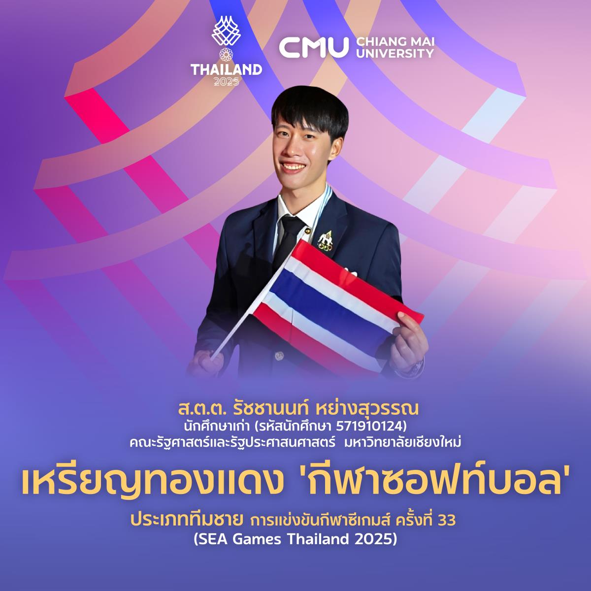 ส.ต.ต. รัชชานนท์ หย่างสุวรรณ นักศึกษาเก่าคณะรัฐศาสตร์และรัฐประศาสนศาสตร์ รหัสนักศึกษา 571910124 สิงห์ขาวรุ่นที่ 50 สร้างผลงานยอดเยี่ยมบนเวทีกีฬาระดับนานาชาติ คว้าเหรียญทองแดง กีฬาซอฟท์บอล ประเภททีมชาย จากการแข่งขันกีฬาซีเกมส์ ครั้งที่ 33 (SEA Games 2025) ความสำเร็จดังกล่าวไม่เพียงนำเหรียญรางวัลมาสู่ประเทศเท่านั้น แต่ยังตอกย้ำศักยภาพ ความทุ่มเท และความสามารถของนักศึกษา มช. ที่สามารถก้าวขึ้นสู่เวทีกีฬาระดับนานาชาติได้อย่างภาคภูมิ