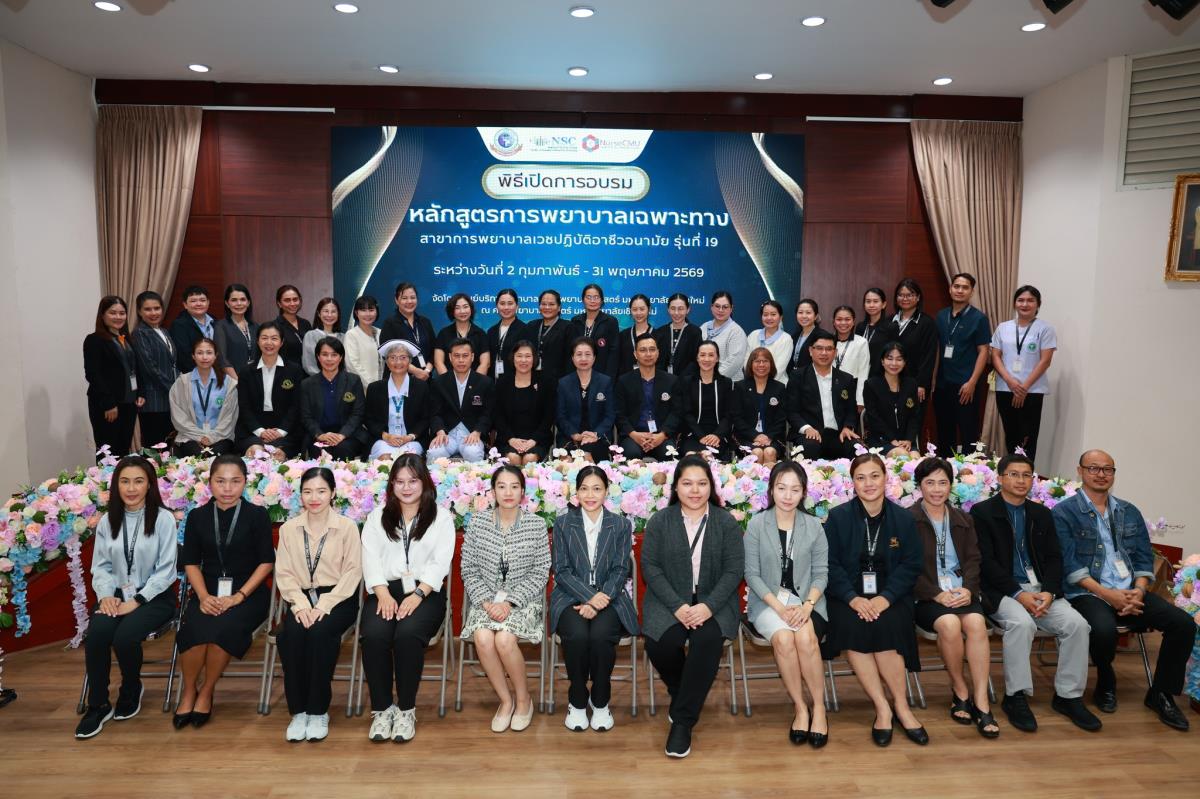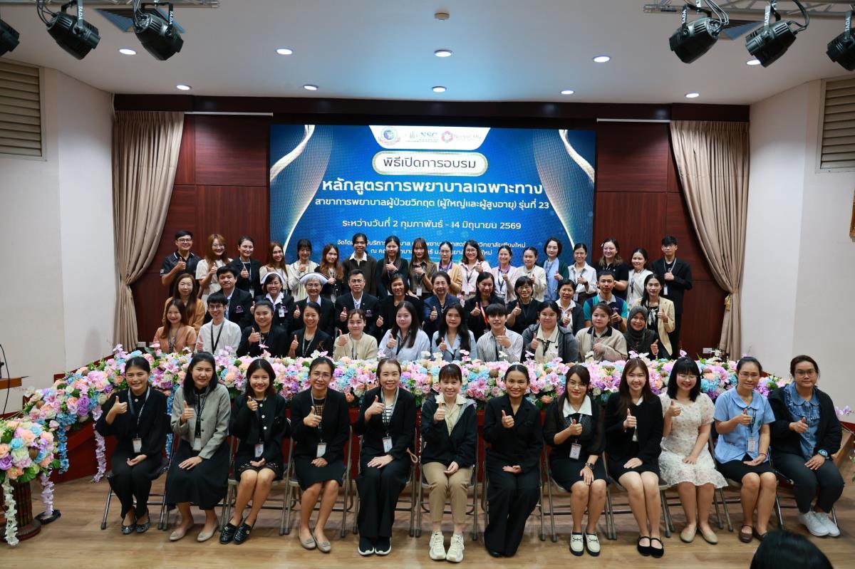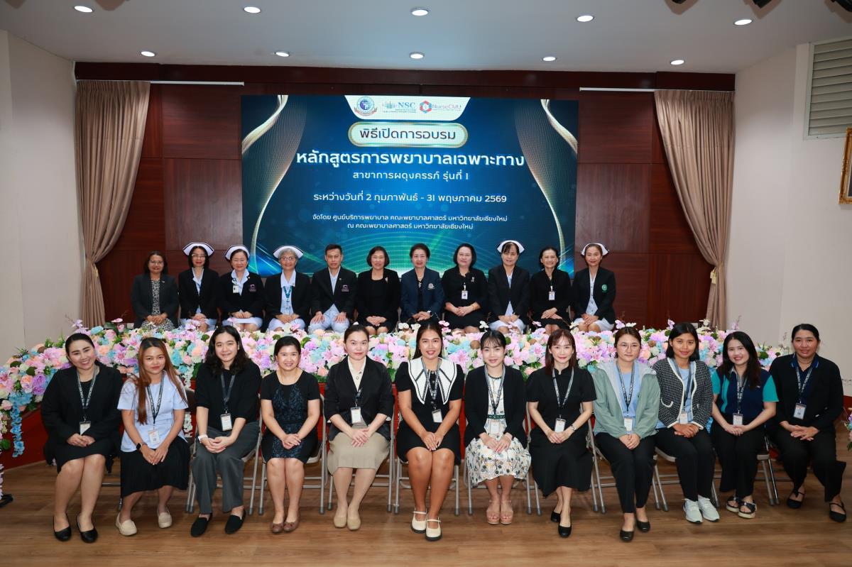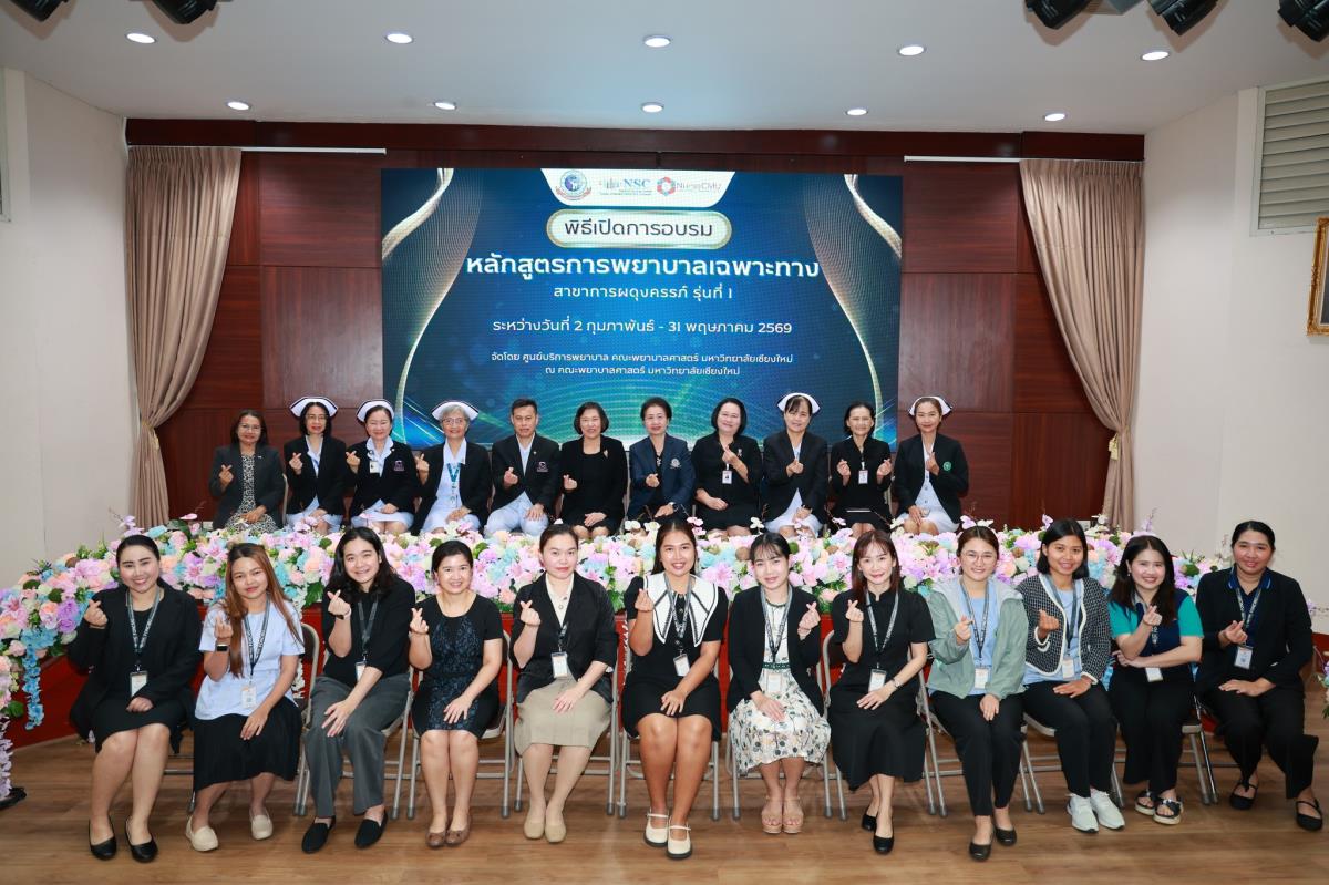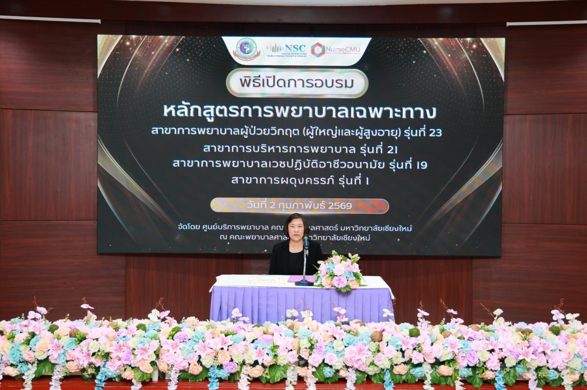 วันจันทร์ที่ 2 กุมภาพันธ์ 2569 ศูนย์บริการพยาบาล คณะพยาบาลศาสตร์ มหาวิทยาลัยเชียงใหม่ จัดพิธีเปิดการอบรมการพยาบาลเฉพาะทาง 4 หลักสูตร โดยมี ผู้ช่วยศาสตราจารย์ ดร.สุภารัตน์ วังศรีคูณ คณบดีคณะพยาบาลศาสตร์ เป็นประธาน พร้อมด้วย ประธานคณะกรรมการแต่ละสาขาได้แก่ ผู้ช่วยศาสตราจารย์ ดร.วราวรรณ อุดมความสุข ประธานคณะกรรมการสาขาการพยาบาลผู้ป่วยวิกฤต (ผู้ใหญ่และผู้สูงอายุ) ผู้ช่วยศาสตราจารย์ ดร.บุญพิชชา จิตต์ภักดี ประธานคณะกรรมการสาขาการบริหารการพยาบาล รองศาสตราจารย์ ดร.วีระพร ศุทธากรณ์ ประธานคณะกรรมการสาขาการพยาบาลเวชปฏิบัติอาชีวอนามัย รองศาสตราจารย์ ดร.นันทพร แสนศิริพันธ์ ประธานคณะกรรมการสาขาการผดุงครรภ์ กล่าวรายงาน ศาสตราจารย์ คลินิก ดร.พรรณพิไล ศรีอาภรณ์ ผู้อำนวยการศูนย์บริการพยาบาล คุณสำราญ พุ่มวัชระ รองหัวหน้าฝ่ายการพยาบาล ด้านพัฒนาทรัพยากรบุคคล โรงพยาบาลมหาราชนครเชียงใหม่ และ คุณจันทร์จีรา กลมมา หัวหน้ากลุ่มงานการพยาบาลผู้คลอด โรงพยาบาลนครพิงค์ กล่าวต้อนรับ ณ ห้องประชุมชั้น 5 อาคาร 4 คณะพยาบาลศาสตร์ มหาวิทยาลัยเชียงใหม่