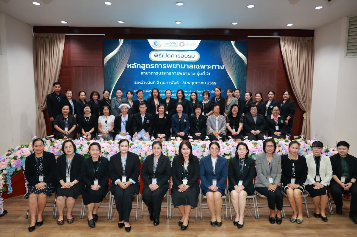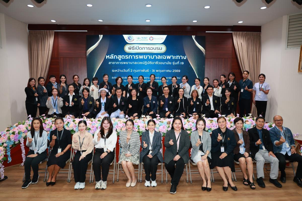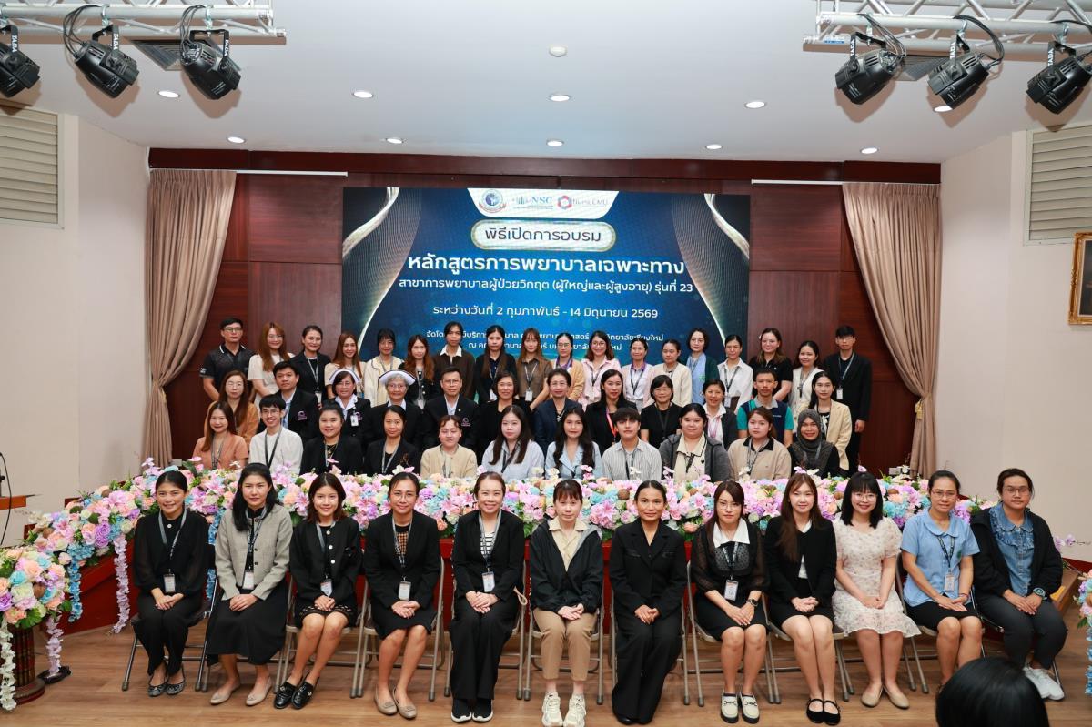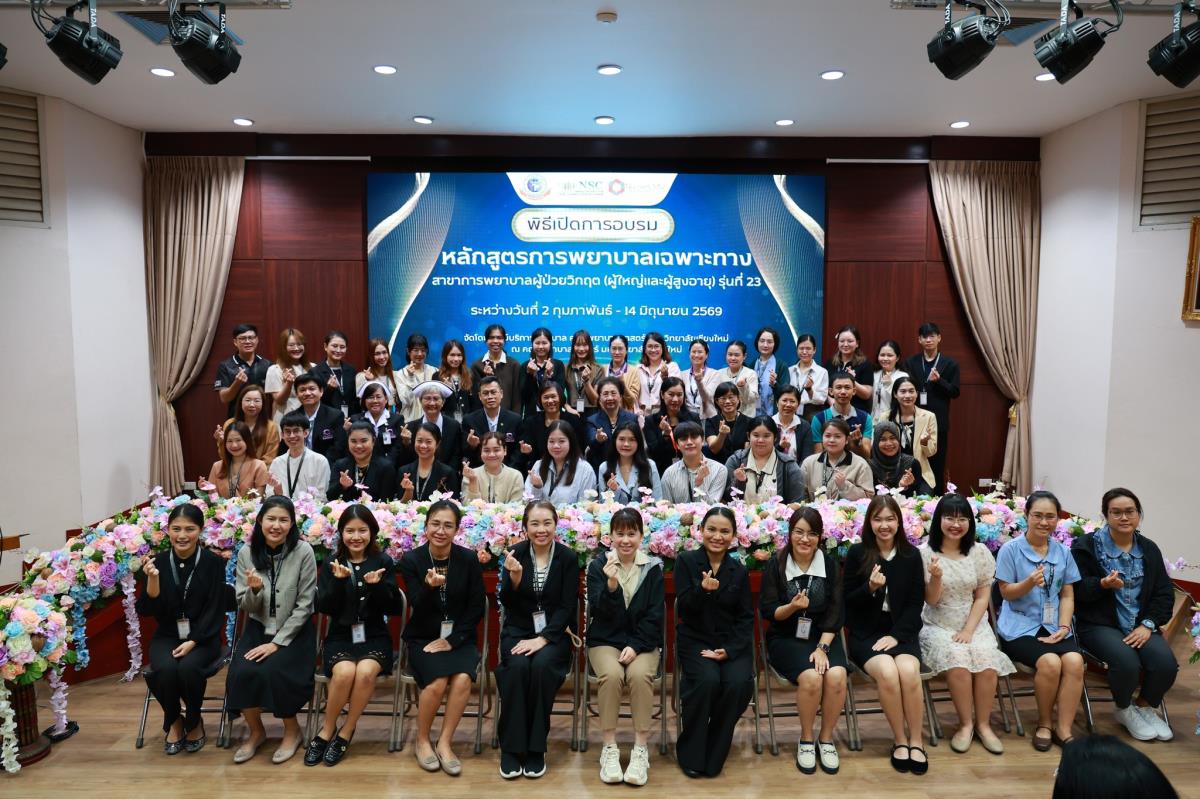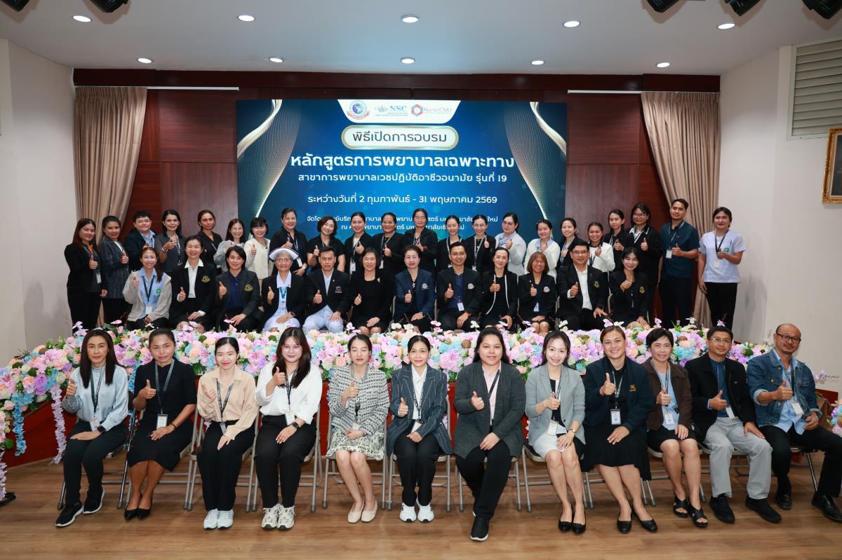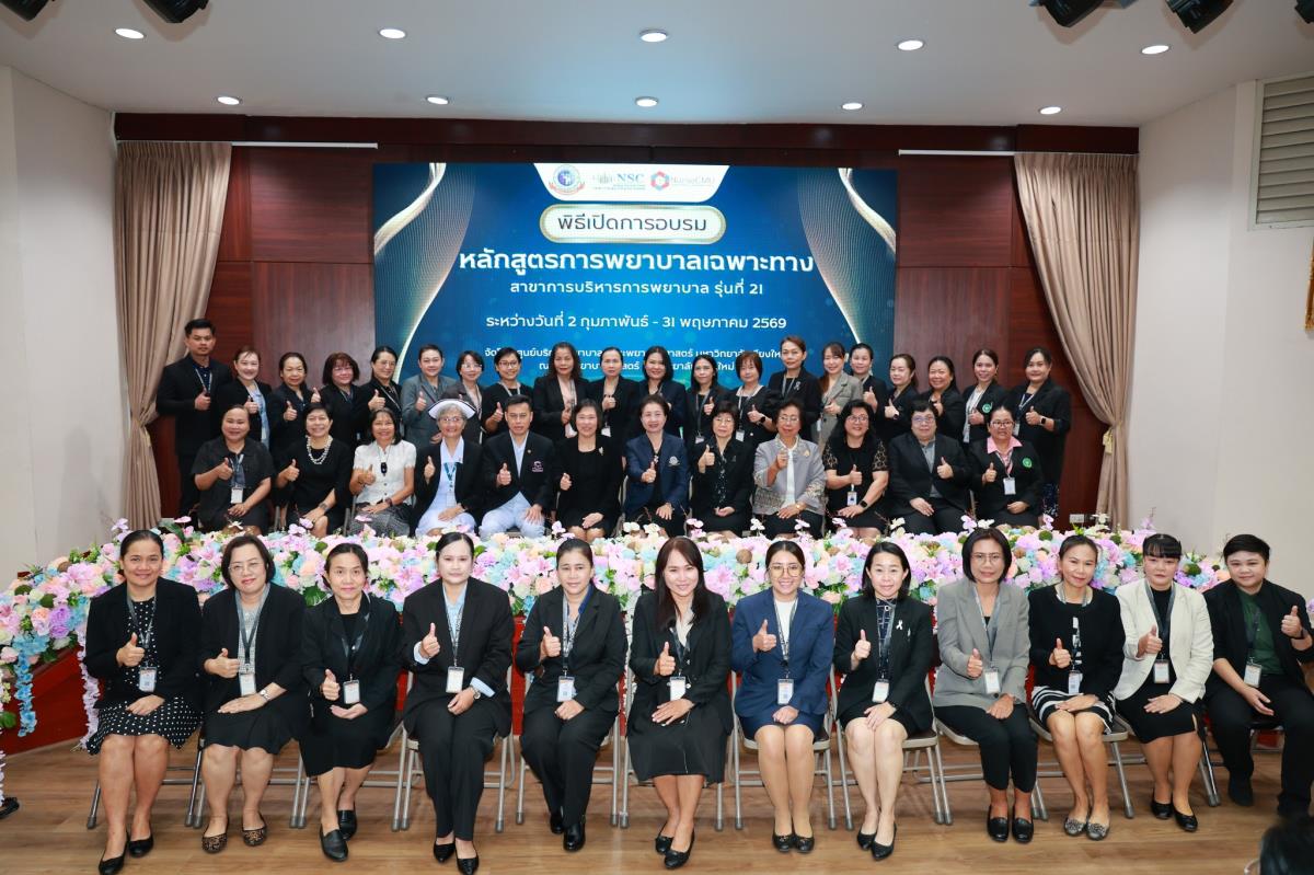 วันจันทร์ที่ 2 กุมภาพันธ์ 2569 ศูนย์บริการพยาบาล คณะพยาบาลศาสตร์ มหาวิทยาลัยเชียงใหม่ จัดพิธีเปิดการอบรมการพยาบาลเฉพาะทาง 4 หลักสูตร โดยมี ผู้ช่วยศาสตราจารย์ ดร.สุภารัตน์ วังศรีคูณ คณบดีคณะพยาบาลศาสตร์ เป็นประธาน พร้อมด้วย ประธานคณะกรรมการแต่ละสาขาได้แก่ ผู้ช่วยศาสตราจารย์ ดร.วราวรรณ อุดมความสุข ประธานคณะกรรมการสาขาการพยาบาลผู้ป่วยวิกฤต (ผู้ใหญ่และผู้สูงอายุ) ผู้ช่วยศาสตราจารย์ ดร.บุญพิชชา จิตต์ภักดี ประธานคณะกรรมการสาขาการบริหารการพยาบาล รองศาสตราจารย์ ดร.วีระพร ศุทธากรณ์ ประธานคณะกรรมการสาขาการพยาบาลเวชปฏิบัติอาชีวอนามัย รองศาสตราจารย์ ดร.นันทพร แสนศิริพันธ์ ประธานคณะกรรมการสาขาการผดุงครรภ์ กล่าวรายงาน ศาสตราจารย์ คลินิก ดร.พรรณพิไล ศรีอาภรณ์ ผู้อำนวยการศูนย์บริการพยาบาล คุณสำราญ พุ่มวัชระ รองหัวหน้าฝ่ายการพยาบาล ด้านพัฒนาทรัพยากรบุคคล โรงพยาบาลมหาราชนครเชียงใหม่ และ คุณจันทร์จีรา กลมมา หัวหน้ากลุ่มงานการพยาบาลผู้คลอด โรงพยาบาลนครพิงค์ กล่าวต้อนรับ ณ ห้องประชุมชั้น 5 อาคาร 4 คณะพยาบาลศาสตร์ มหาวิทยาลัยเชียงใหม่