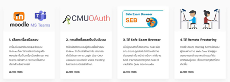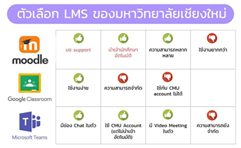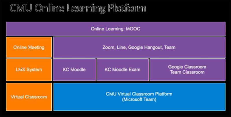 มหาวิทยาลัยได้จัดหา Plate Form กลางเป็นห้องเรียนเสมือน โดยใช้โปรแกรม Moodle Google Classroom และ Microsoft Teams ผสานกับสำนักทะเบียนและประมวลผล รวบรวมรายวิชาทั้งหมดที่จะเปิดสอนในเทอมหน้าเข้ามาไว้ในระบบ สามารถ Log in เพื่อเข้าไปดูรายละเอียดด้วย CMU account @cmu.ac.th