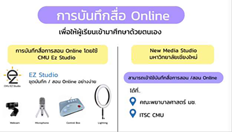 - ITSC มีฝ่ายผลิตสื่อที่สามารถแนะนำ ให้คำปรึกษาอาจารย์ได้ นอกจากนั้น อาจารย์ยังสามารถบันทึกสื่อออนไลน์ได้ด้วยตนเองผ่าน EZ studio
