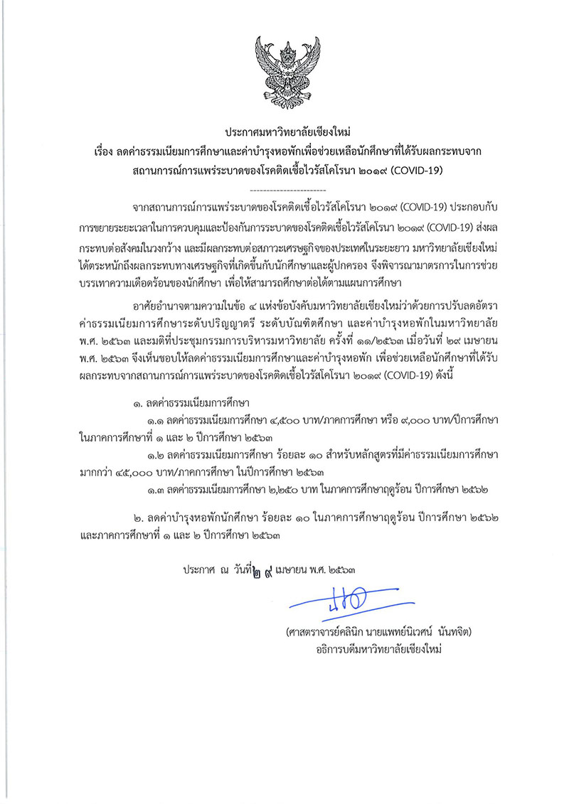 ประกาศมหาวิทยาลัยเชียงใหม่ เรื่องลกค่าธรรมเนียมการศึกษาและค่าบำรุงหอพักเพื่อช่วยเหลือนักศึกษาที่ได้รับผลกระทบจากสถานการณ์การแพร่ระบาดของโรคติดต่อเชื่อไวรัสโคโรนา 2019 (COVID-19)