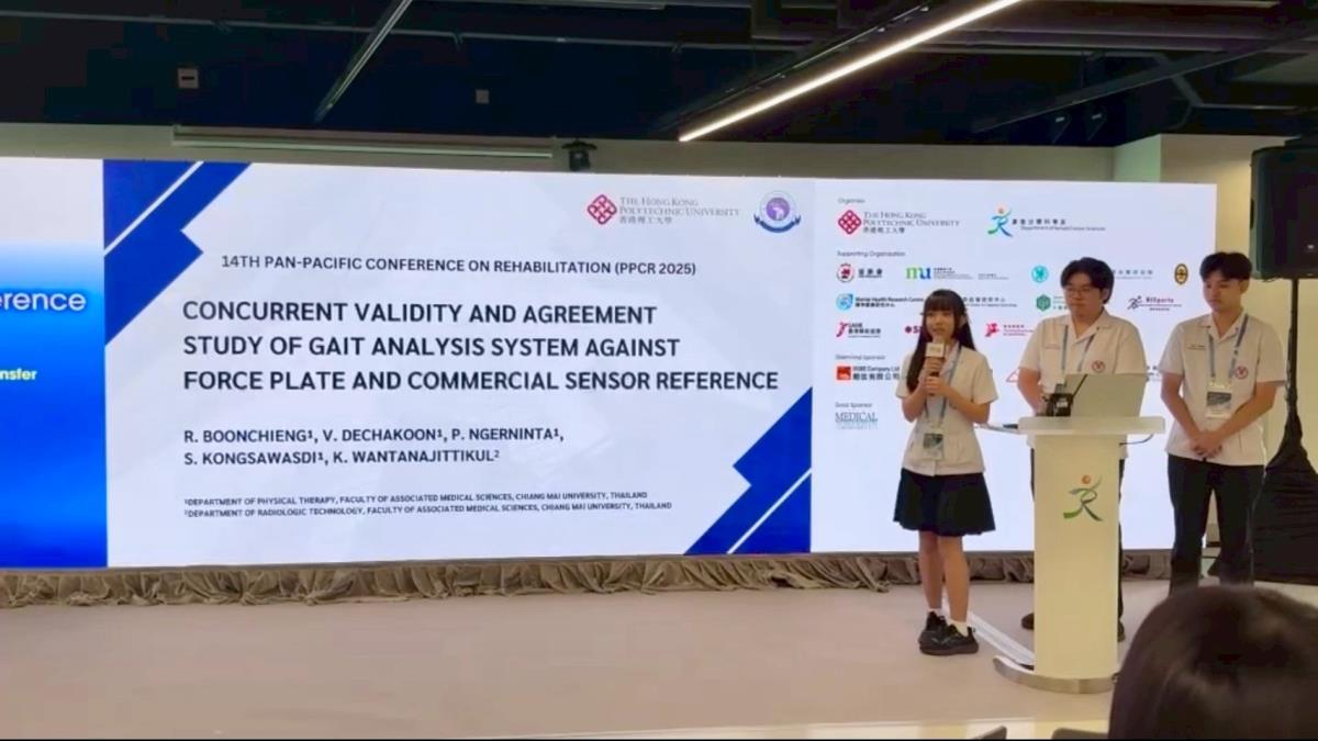โดยนำเสนองานวิจัยภาคนิพนธ์เรื่อง Concurrent Validity and Agreement Study of Gait Analysis System Against Force Plate and Commercial Sensor Reference โดยมี ผศ.ดร.ศิริพันธุ์ คงสวัสดิ์ และ ผศ.ดร.กิตติชัย วรรธนะจิตติกุล เป็นอาจารย์ที่ปรึกษา ในงานประชุมวิชาการ The 14th Pan-Pacific Conference on Rehabilitation (PPCR 2025) " Innovations in Rehabilitation Sciences: Research, Education and Knowledge Transfer" ณ InnoCentre เกาลูน เขตบริหารพิเศษฮ่องกง ระหว่างวันที่ 8-9 พฤศจิกายน 2568
