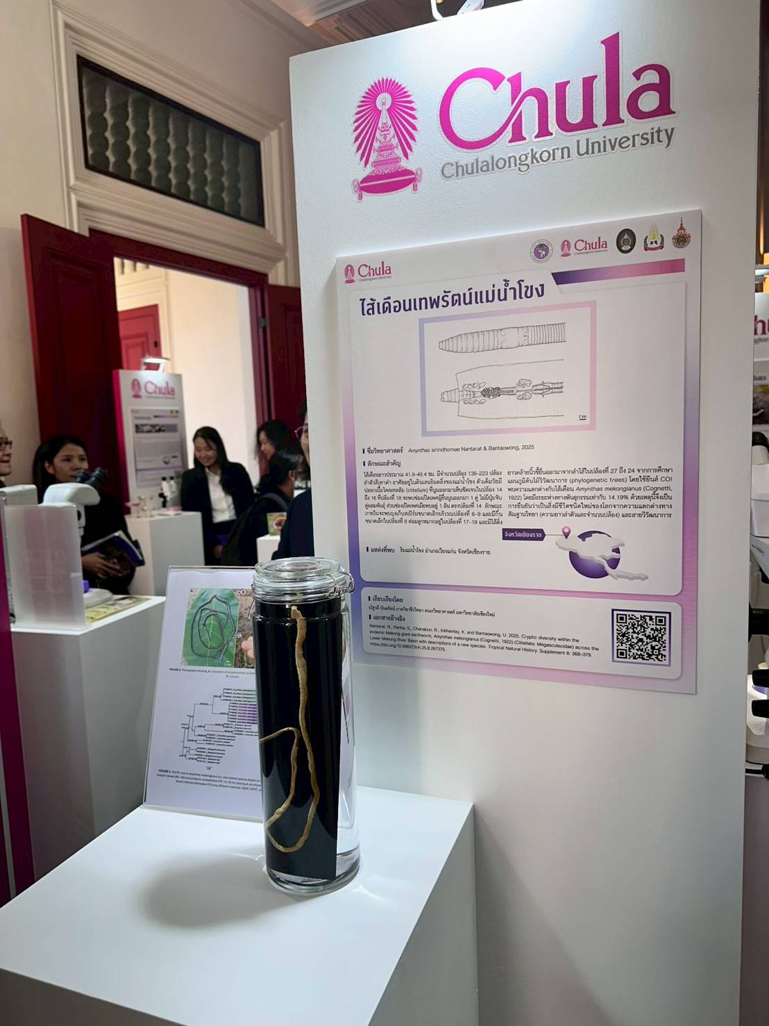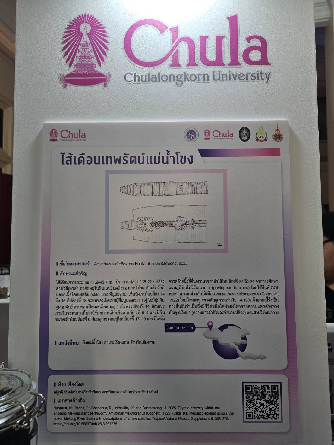 ทั้งนี้ 1 ใน สิ่งมีชีวิตชนิดใหม่ของโลกที่ค้นพบในประเทศไทย และมีการจัดแสดงในงานดังกล่าว คือ ไส้เดือนเทพรัตน์แม่น้ำโขง