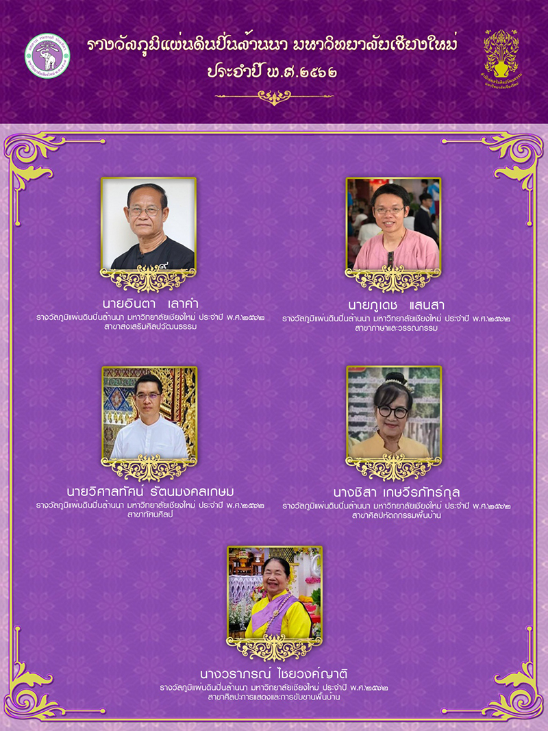 โดยมีวัตถุประสงค์เพื่อเป็นการส่งเสริมสนับสนุนให้บุคคลทั่วไป ได้ตระหนักถึงคุณค่าของผู้สืบสานวัฒนธรรมล้านนา และเชิดชูเกียรติประวัติแก่ผู้ที่ทำประโยชน์ต่อสังคมและส่วนรวม โดยผลการคัดเลือกรางวัลภูมิแผ่นดิน ปิ่นล้านนา มหาวิทยาลัยเชียงใหม่ ประจำปีพุทธศักราช 2562 มีผู้ได้รับรางวัลจำนวน 5 ท่าน ดังนี้