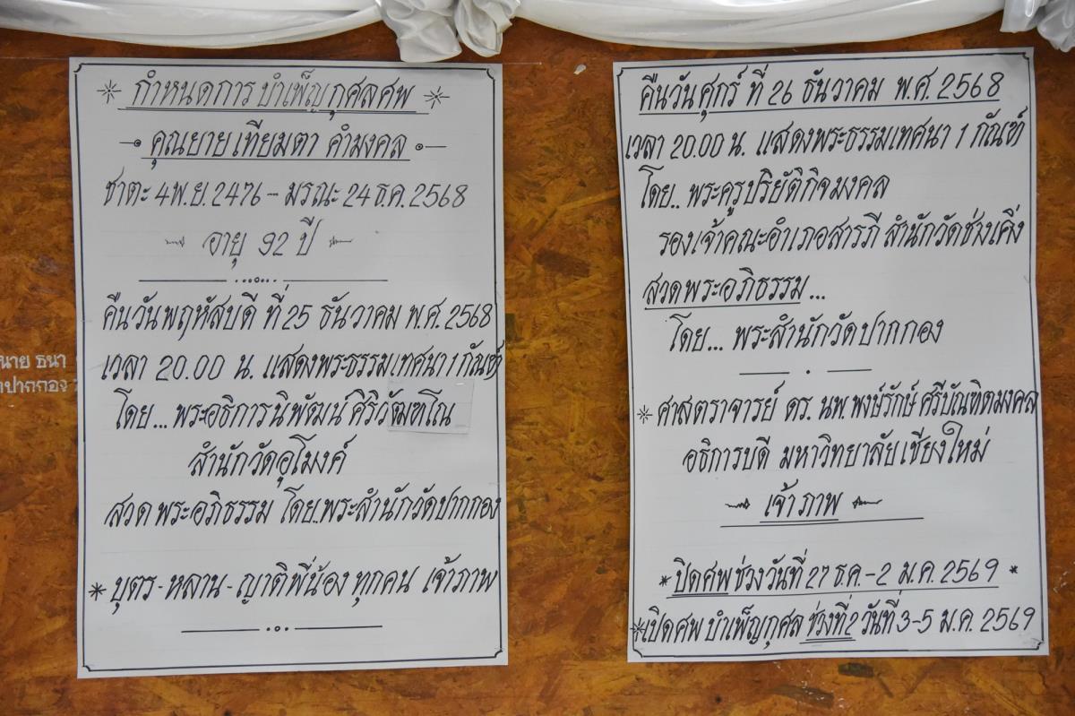 ศาสตราจารย์ ดร.นพ.พงษ์รักษ์ ศรีบัณฑิตมงคล อธิการบดีมหาวิทยาลัยเชียงใหม่ เป็นประธานในพิธีแสดงพระธรรมเทศนา สวดพระอภิธรรมบำเพ็ญกุศลศพ คุณแม่เทียมตา คำมงคล ซึ่งเป็นมารดาของ คุณเยาวลักษณ์ วิริยะพงศ์ ที่ปรึกษาอธิการบดี โดยมีคณะผู้บริหารและเจ้าหน้าที่มหาวิทยาลัยเชียงใหม่ ร่วมพิธี ณ ศาลาอเนกประสงค์ วัดปากกอง อ.สารภี จ.เชียงใหม่ วันศุกร์ที่ 26 ธันวาคม พ.ศ. 2568
