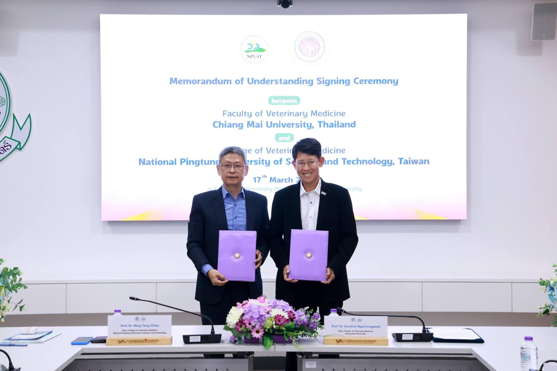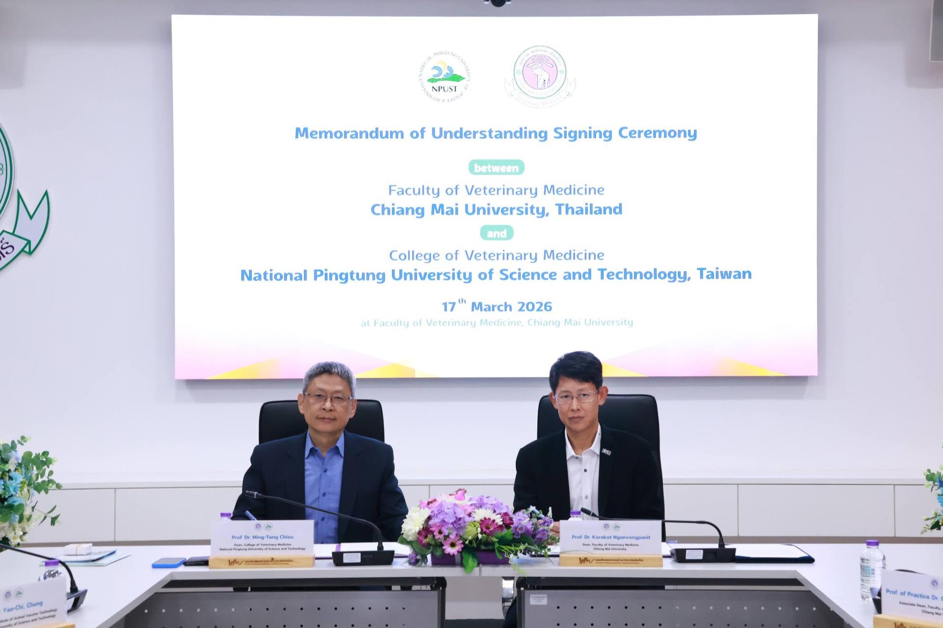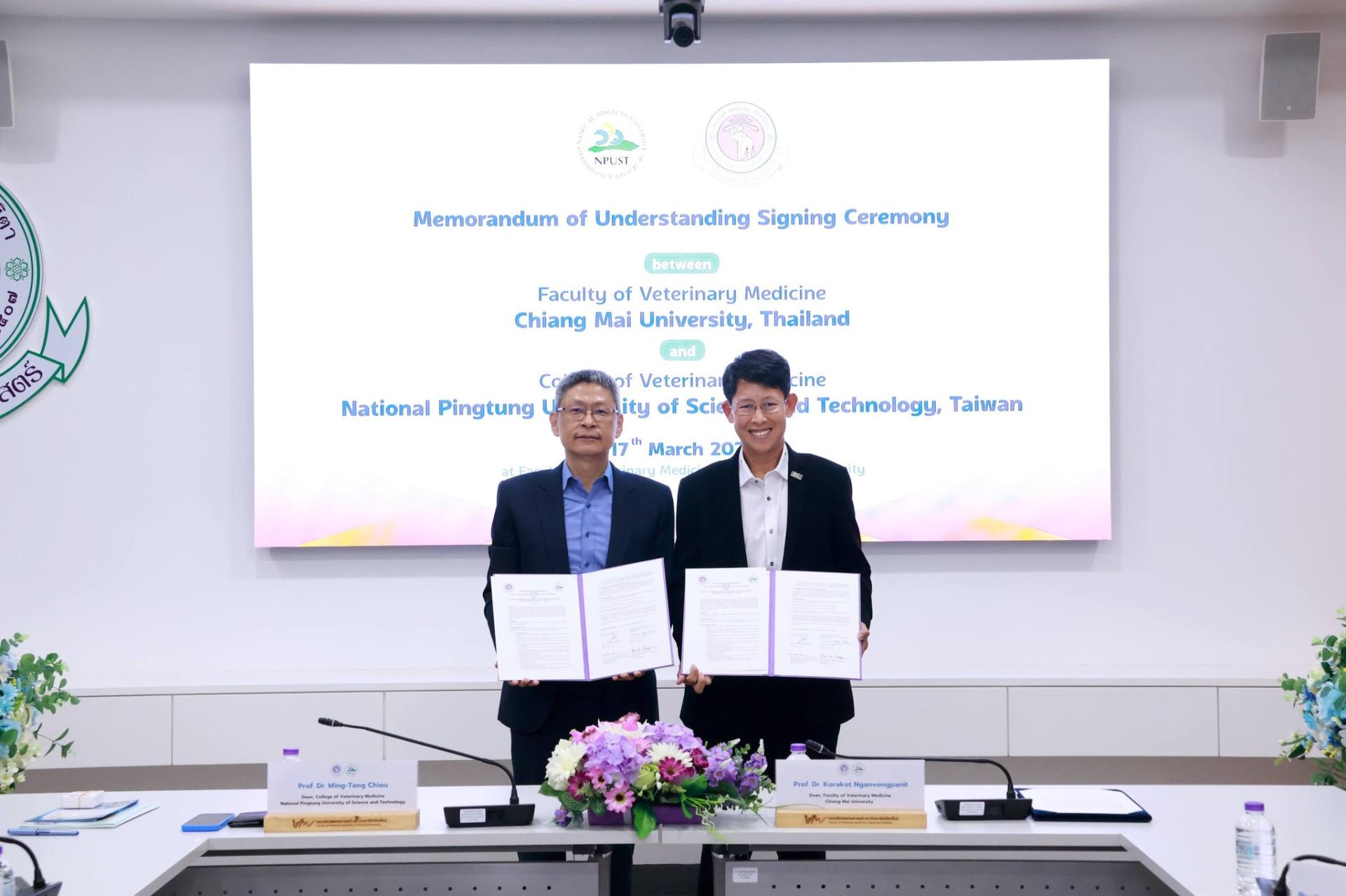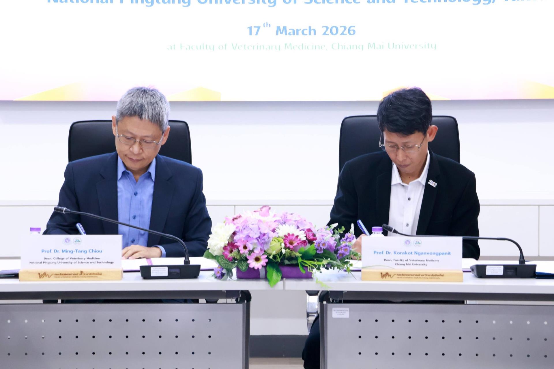 คณะสัตวแพทยศาสตร์ มหาวิทยาลัยเชียงใหม่ ร่วมกับ College of Veterinary Medicine, National Pingtung University of Science and Technology สาธารณรัฐประชาชนจีน (ไต้หวัน) จัดพิธีลงนามบันทึกความร่วมมือทางวิชาการ โดยมี Prof. Dr. Ming-Tang Chiou คณบดี College of Veterinary Medicine, National Pingtung University of Science and Technology และ ศ. (เชี่ยวชาญพิเศษ) ดร.น.สพ.กรกฎ งานวงศ์พาณิชย์ คณบดีคณะสัตวแพทยศาสตร์ มหาวิทยาลัยเชียงใหม่ ร่วมลงนามในบันทึกความร่วมมือดังกล่าว พร้อมด้วย ศ.ปฏิบัติ ดร.น.สพ.ฉัตรโชติ ทิตาราม รองคณบดีฝ่ายวิจัย นวัตกรรม และวิเทศสัมพันธ์ และคณะผู้บริหาร ร่วมเป็นสักขีพยาน