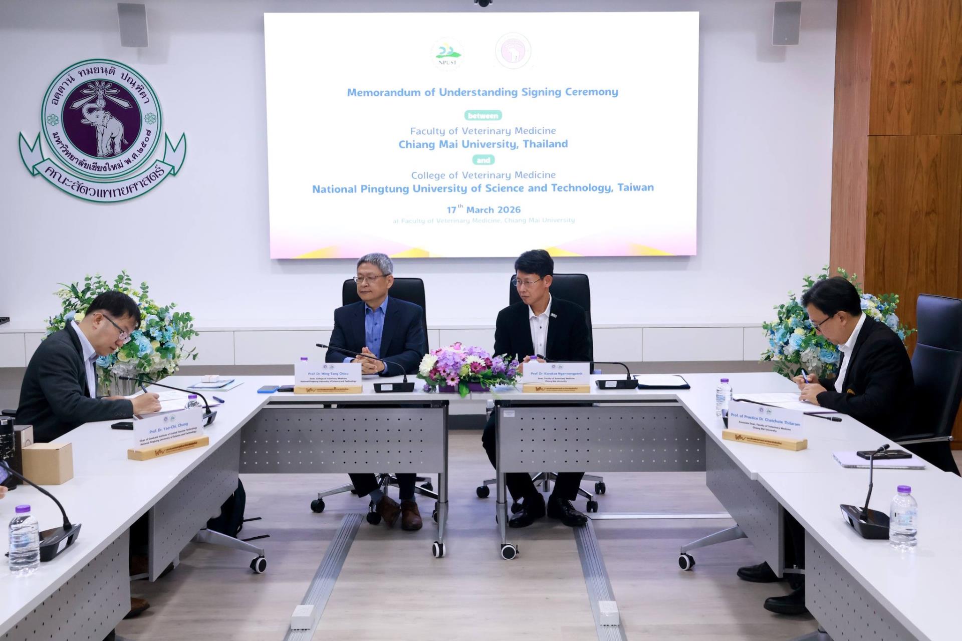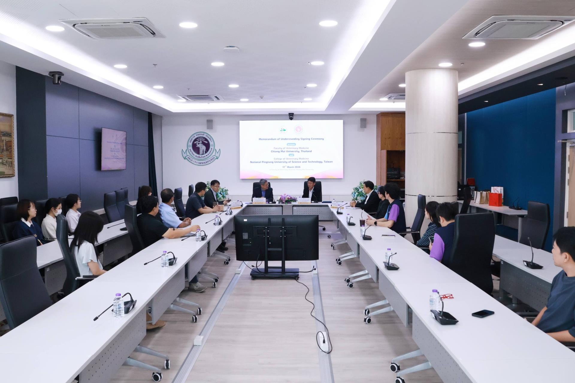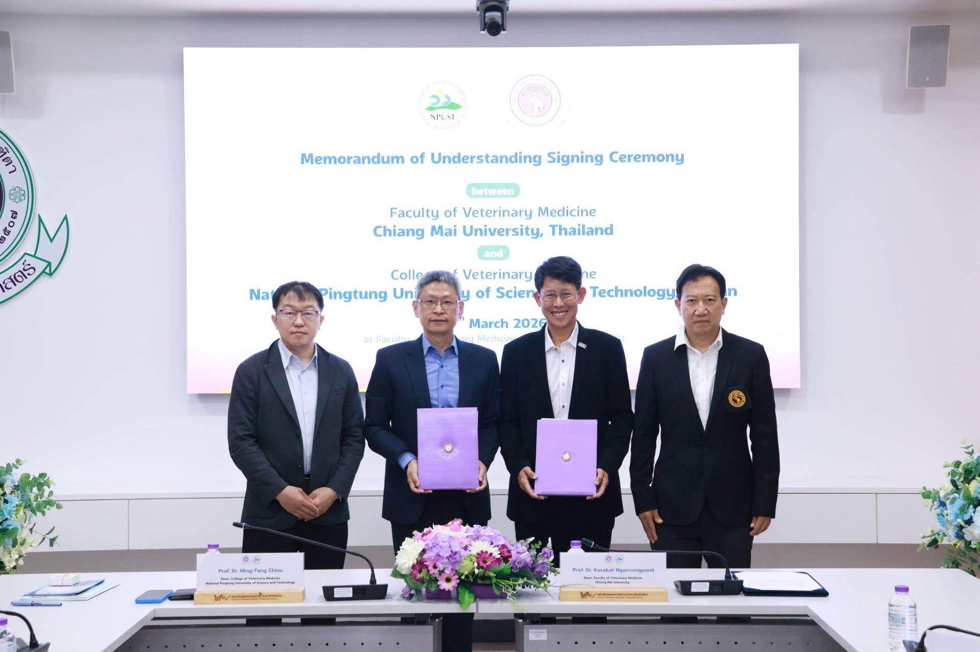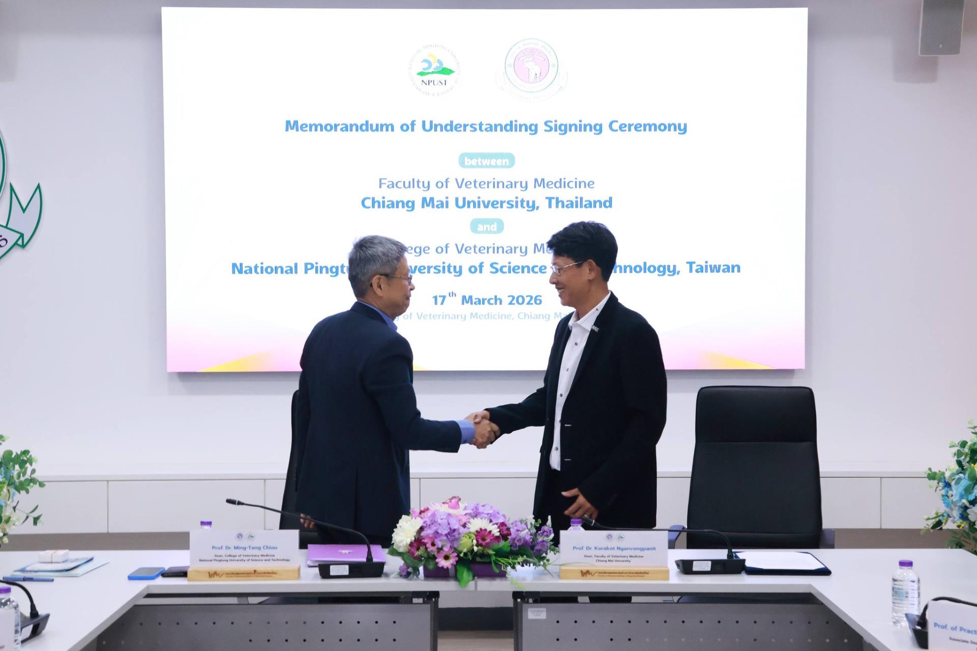 คณะสัตวแพทยศาสตร์ มหาวิทยาลัยเชียงใหม่ ร่วมกับ College of Veterinary Medicine, National Pingtung University of Science and Technology สาธารณรัฐประชาชนจีน (ไต้หวัน) จัดพิธีลงนามบันทึกความร่วมมือทางวิชาการ โดยมี Prof. Dr. Ming-Tang Chiou คณบดี College of Veterinary Medicine, National Pingtung University of Science and Technology และ ศ. (เชี่ยวชาญพิเศษ) ดร.น.สพ.กรกฎ งานวงศ์พาณิชย์ คณบดีคณะสัตวแพทยศาสตร์ มหาวิทยาลัยเชียงใหม่ ร่วมลงนามในบันทึกความร่วมมือดังกล่าว พร้อมด้วย ศ.ปฏิบัติ ดร.น.สพ.ฉัตรโชติ ทิตาราม รองคณบดีฝ่ายวิจัย นวัตกรรม และวิเทศสัมพันธ์ และคณะผู้บริหาร ร่วมเป็นสักขีพยาน