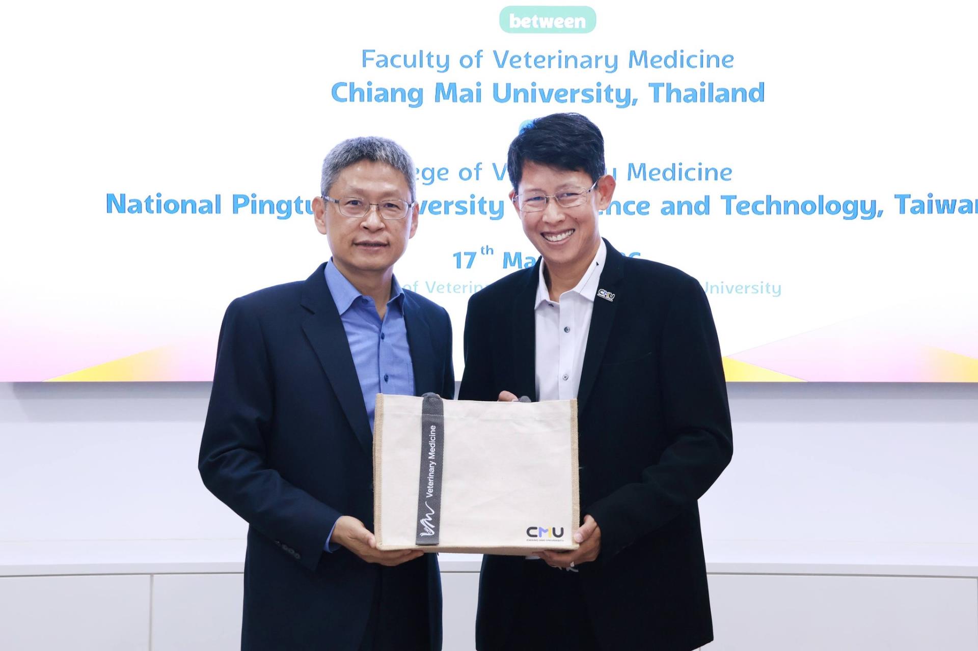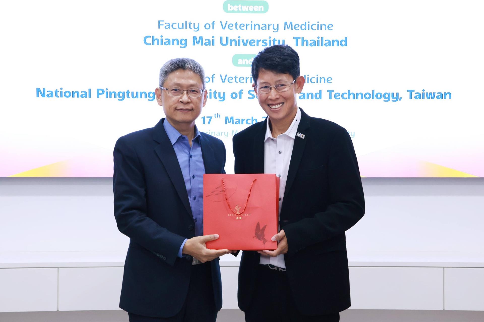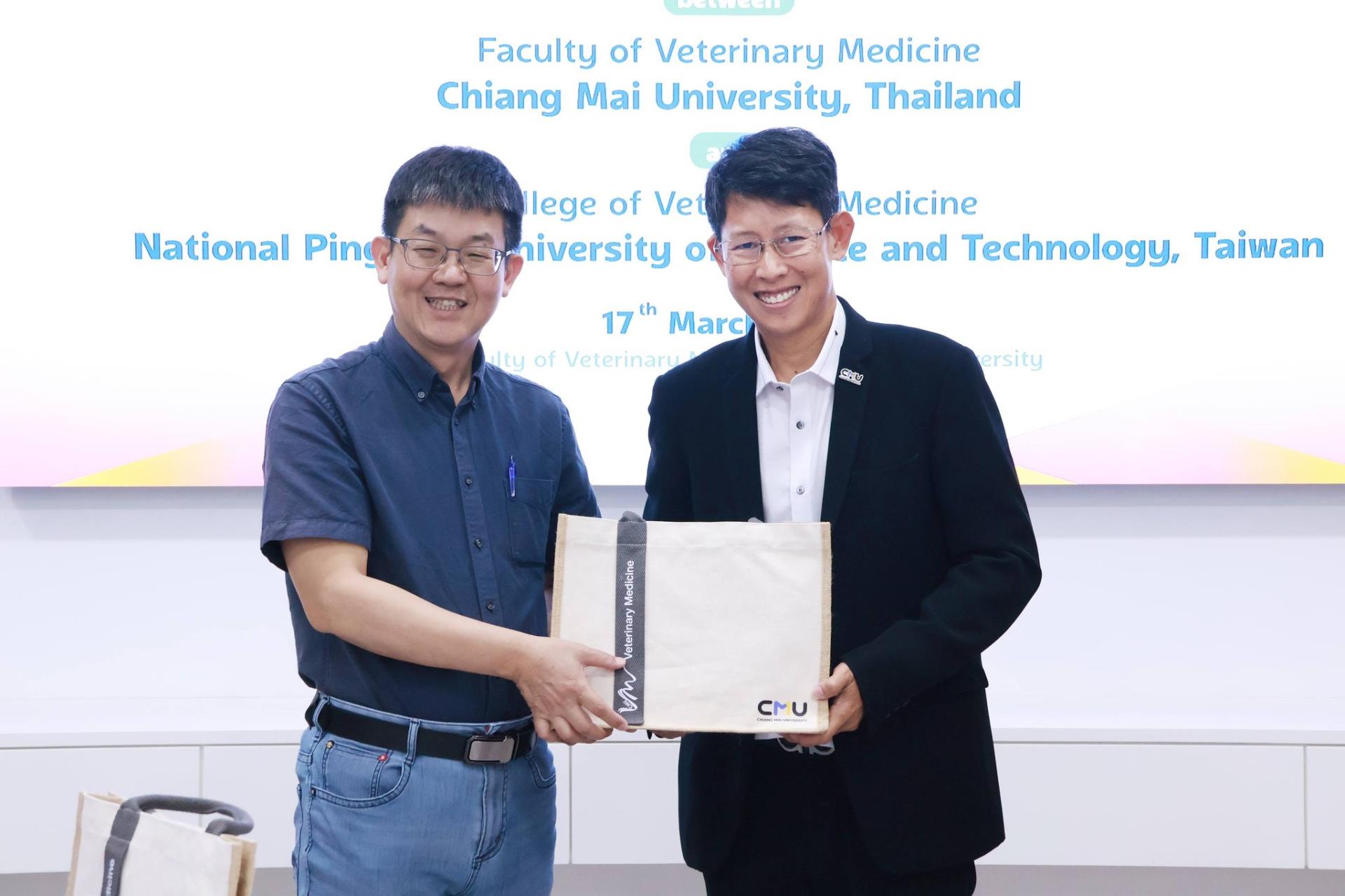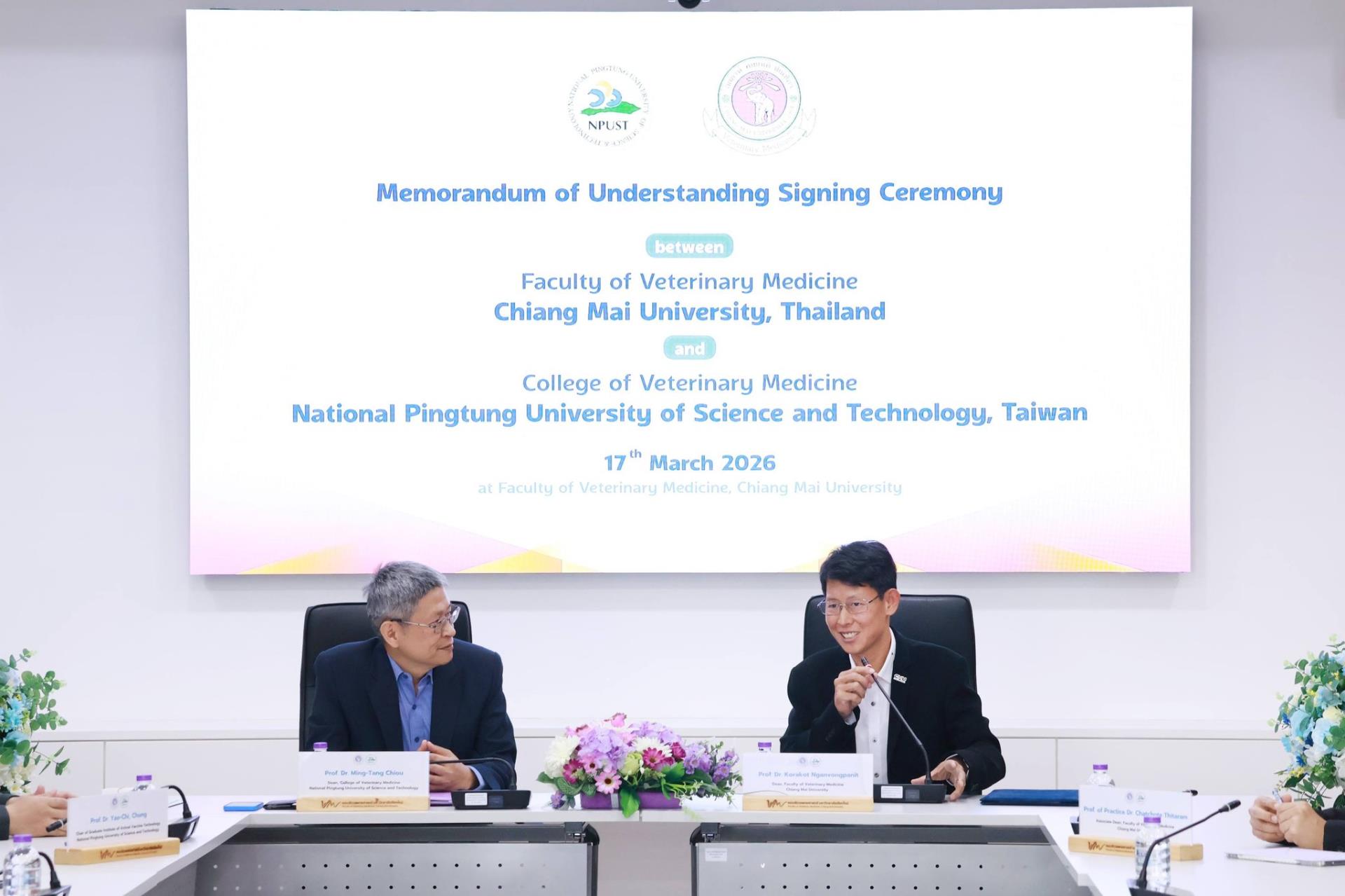 คณะสัตวแพทยศาสตร์ มหาวิทยาลัยเชียงใหม่ ร่วมกับ College of Veterinary Medicine, National Pingtung University of Science and Technology สาธารณรัฐประชาชนจีน (ไต้หวัน) จัดพิธีลงนามบันทึกความร่วมมือทางวิชาการ โดยมี Prof. Dr. Ming-Tang Chiou คณบดี College of Veterinary Medicine, National Pingtung University of Science and Technology และ ศ. (เชี่ยวชาญพิเศษ) ดร.น.สพ.กรกฎ งานวงศ์พาณิชย์ คณบดีคณะสัตวแพทยศาสตร์ มหาวิทยาลัยเชียงใหม่ ร่วมลงนามในบันทึกความร่วมมือดังกล่าว พร้อมด้วย ศ.ปฏิบัติ ดร.น.สพ.ฉัตรโชติ ทิตาราม รองคณบดีฝ่ายวิจัย นวัตกรรม และวิเทศสัมพันธ์ และคณะผู้บริหาร ร่วมเป็นสักขีพยาน
