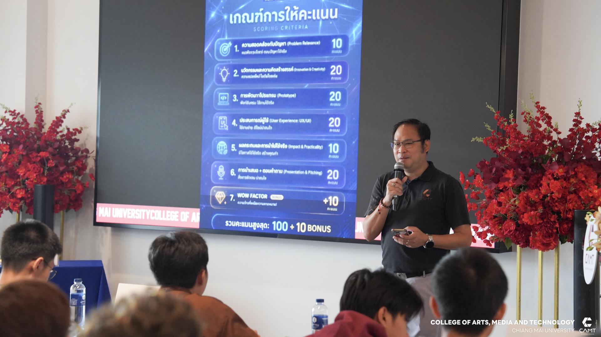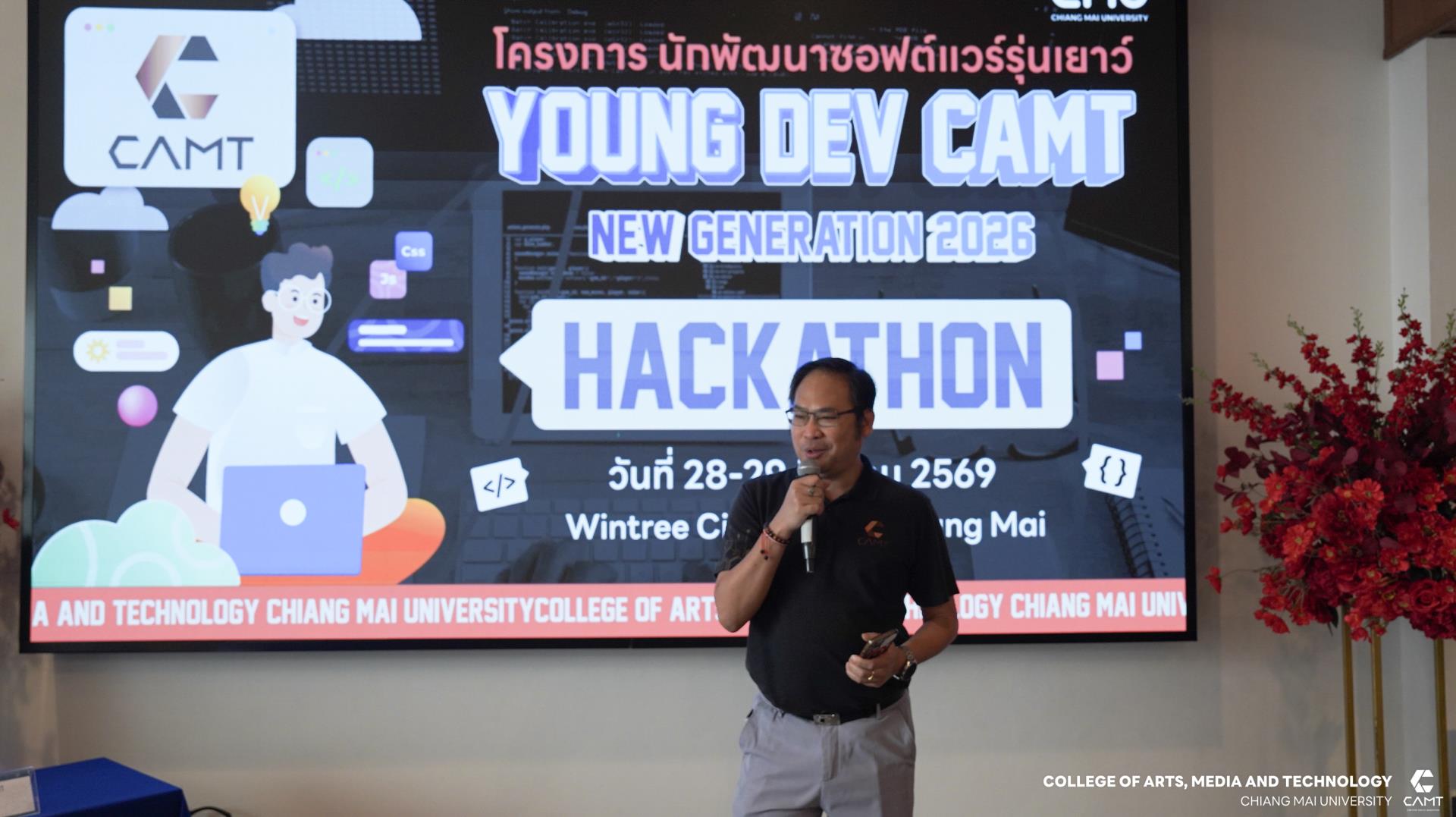วิทยาลัยศิลปะ สื่อ และเทคโนโลยี มหาวิทยาลัยเชียงใหม่ ปิดฉากโครงการนักพัฒนาซอฟต์แวร์รุ่นเยาว์ (Young DEV CAMT New Generation 2026) อย่างสมบูรณ์แบบ ด้วยการจัดกิจกรรมการแข่งขัน Hackathon รอบชิงชนะเลิศ ระหว่างวันที่ 28-29 มีนาคม 2569 ณ โรงแรม Wintree City Resort Chiang Mai โดยได้รับเกียรติจาก ผู้ช่วยศาสตราจารย์ ดร.จิราวิทย์ ญาณจินดา รองคณบดีวิทยาลัยศิลปะ สื่อ และเทคโนโลยี เป็นประธานในพิธีปิด พร้อมทั้งมอบเกียรติบัตรและประกาศผลรางวัลให้แก่ผู้เข้าร่วมโครงการ