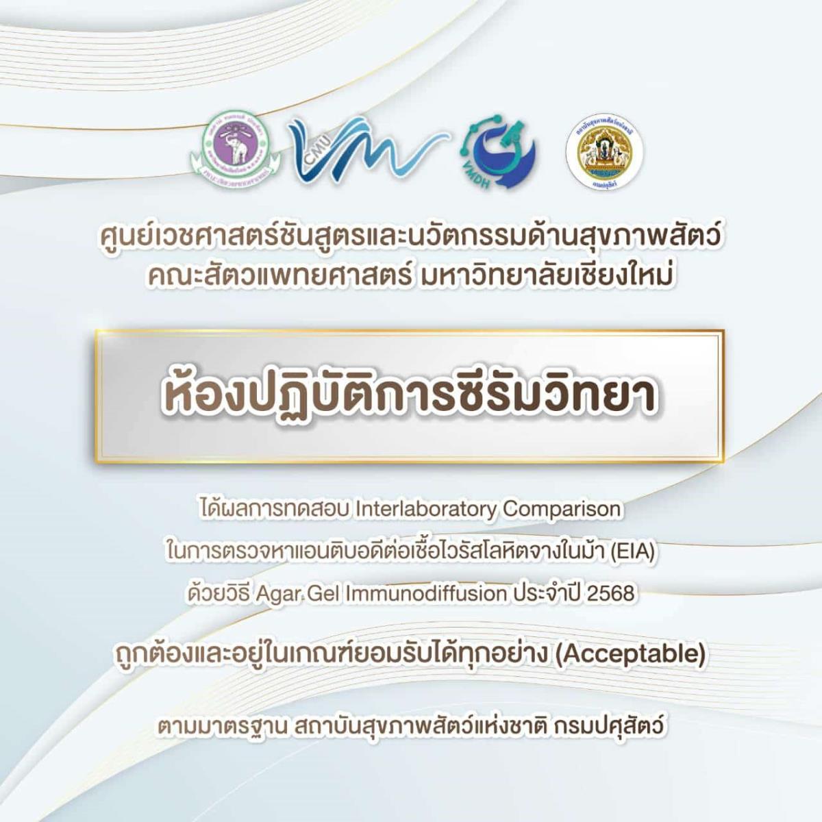 ศูนย์เวชศาสตร์ชันสูตรและนวัตกรรมด้านสุขภาพสัตว์ คณะสัตวแพทยศาสตร์ มช. ได้ผลการทดสอบ Interlaboratory Comparison ถูกต้องและอยู่ในเกณฑ์ยอมรับได้ทุกอย่าง (Acceptable) ประจำปี 2568 ในการตรวจหาแอนติบอดีต่อเชื้อไวรัสโลหิตจางในม้า (EIA) ด้วยวิธี Agar Gel Immunodiffusion ตามมาตรฐาน สถานบันสุขภาพสัตว์แห่งชาติ กรมปศุสัตว์