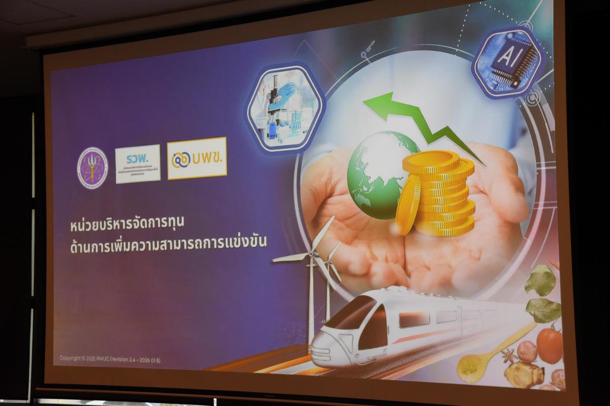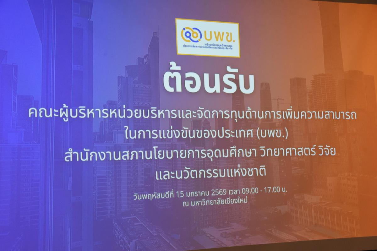 ศาสตราจารย์ ดร.นพ.พงษ์รักษ์ ศรีบัณฑิตมงคล อธิการบดีมหาวิทยาลัยเชียงใหม่ พร้อมด้วยรองศาสตราจารย์ ดร.วินิตา บุณโยดม รองอธิการบดี รองศาสตราจารย์ ดร.ปิติวัฒน์ วัฒนชัย ผู้อำนวยการอุทยานวิทยาศาสตร์และเทคโนโลยี มหาวิทยาลัยเชียงใหม่ (STeP) คณะผู้บริหารและเจ้าหน้าที่ ให้การต้อนรับ รองศาสตราจารย์ ดร.กานดา บุญโสธรสถิตย์ ผู้อำนวยการ หน่วยบริหารและจัดการทุนด้านการเพิ่มความสามารถในการแข่งขันของประเทศ (Program Management Unit for Competitiveness - PMUC) (บพข.) ในโอกาสที่มาประชุม ปรึกษาหารือแลกเปลี่ยนข้อคิดเห็น เกี่ยวกับการจัดสรรทุนวิจัยและนวัตกรรมของมหาวิทยาลัยเชียงใหม่ การผลักดันงานวิจัยร่วมกับภาคเอกชนและภาครัฐในการเพิ่มขีดความสามารถทางการแข่งขันในระดับสากล ผ่านการสร้างอุตสาหกรรมและบริการคุณภาพสูง และเยี่ยมชมนิทรรศการและผลงานด้านงานวิจัยและนวัตกรรมของมหาวิทยาลัยเชียงใหม่ ณ ห้อง D206 ชั้น 2 อาคาร D อุทยานวิทยาศาสตร์และเทคโนโลยี มหาวิทยาลัยเชียงใหม่ (STeP) วันพฤหัสบดีที่ 15 มกราคม พ.ศ. 2569