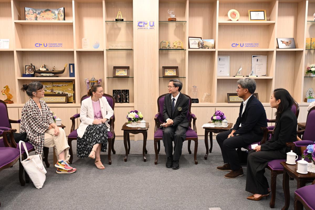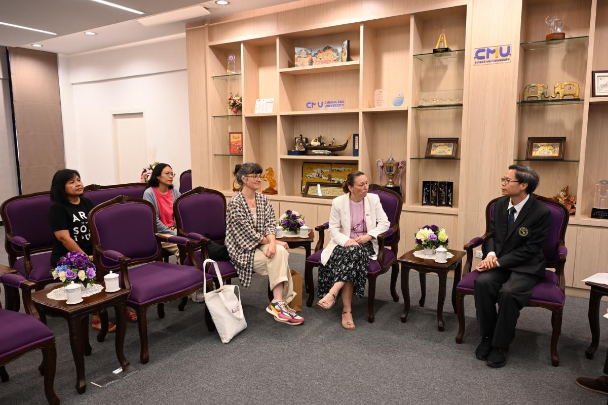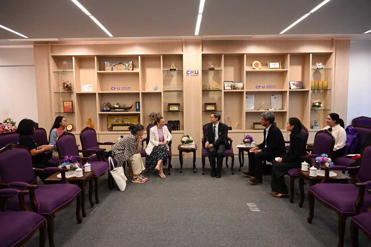 รองศาสตราจารย์ ดร.ปิยะพงศ์ เนียมทรัพย์ ผู้ช่วยอธิการบดีมหาวิทยาลัยเชียงใหม่ ให้การต้อนรับ Mrs. Lise Talbot Barre ที่ปรึกษาฝ่ายวัฒนธรรมและความร่วมมือ และ Mr. Astrid RENOUX ผู้ช่วยทูตฝ่ายวัฒนธรรม สถานเอกอัครราชทูตฝรั่งเศสประจำประเทศไทย ในโอกาสที่มาเยี่ยมเยือนมหาวิทยาลัยเชียงใหม่ เพื่อปรึกษาหารือเกี่ยวกับความร่วมมือทางวิชาการ ณ ห้องรับรอง มล.ปิ่น มาลากุล อาคารสำนักงานมหาวิทยาลัย 1 มหาวิทยาลัยเชียงใหม่ วันศุกร์ที่ 29 พฤศจิกายน พ.ศ. 2567
