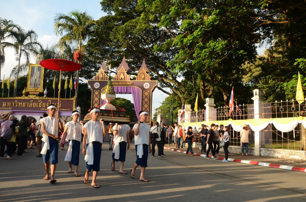 ขบวนงานประเพณีลูกช้างขึ้นดอยนี้นักศึกษาแต่ละคณะผู้ร่วมขบวนต่างพร้อมใจสวมชุดพื้นเมืองอันเป็นเอกลักษณ์ของชาวเชียงใหม่ เพื่อส่งเสริมและอนุรักษ์วัฒนธรรมของล้านนา โดยขบวนจะเริ่มเดินออกจากประตูหน้ามหาวิทยาลัยเชียงใหม่ สู่ถนนห้วยแก้ว แล้วมุ่งหน้าเดินขึ้นไปนมัสการพระบรมธาตุดอยสุเทพ เมื่อถึงจุดหมายปลายทางนักศึกษาจะได้สักการะพระบรมธาตุดอยสุเทพ พร้อมกันนี้ได้มีพิธีทอดผ้าป่า เพื่อความเป็นสิริมงคลแก่ลูกช้าง แล้วเดินทางกลับด้วยรถตู้ที่มหาวิทยาลัยได้จัดเตรียมไว้