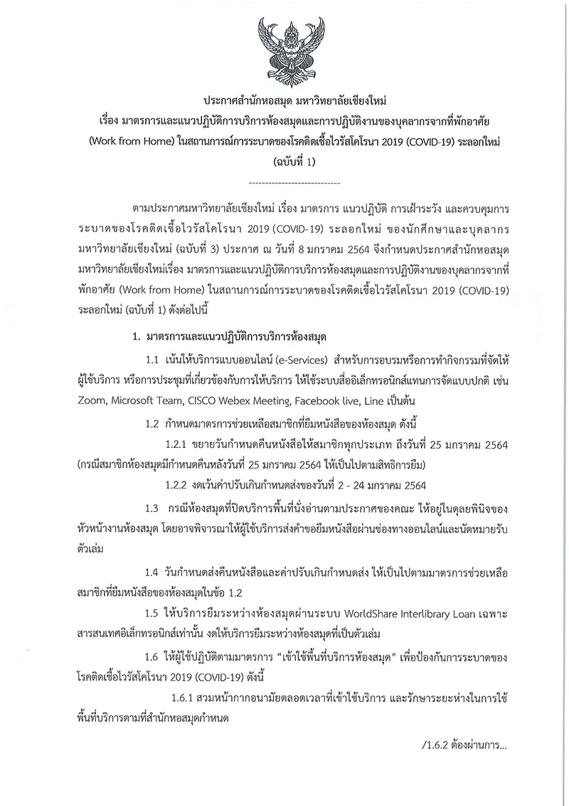 ประกาศสำนักหอสมุด มหาวิทยาลัยเชียงใหม่ เรื่อง มาตรการและแนวปฏิบัติการบริการห้องสมุดและการปฏิบัติงานของบุคลากรจากที่พักอาศัย (Work from Home) ในสถานการณ์การระบาดของโรคติดเชื้อไวรัสโคโรนา 2019 (COVID-19) ระลอกใหม่ (ฉบับที่ 1)