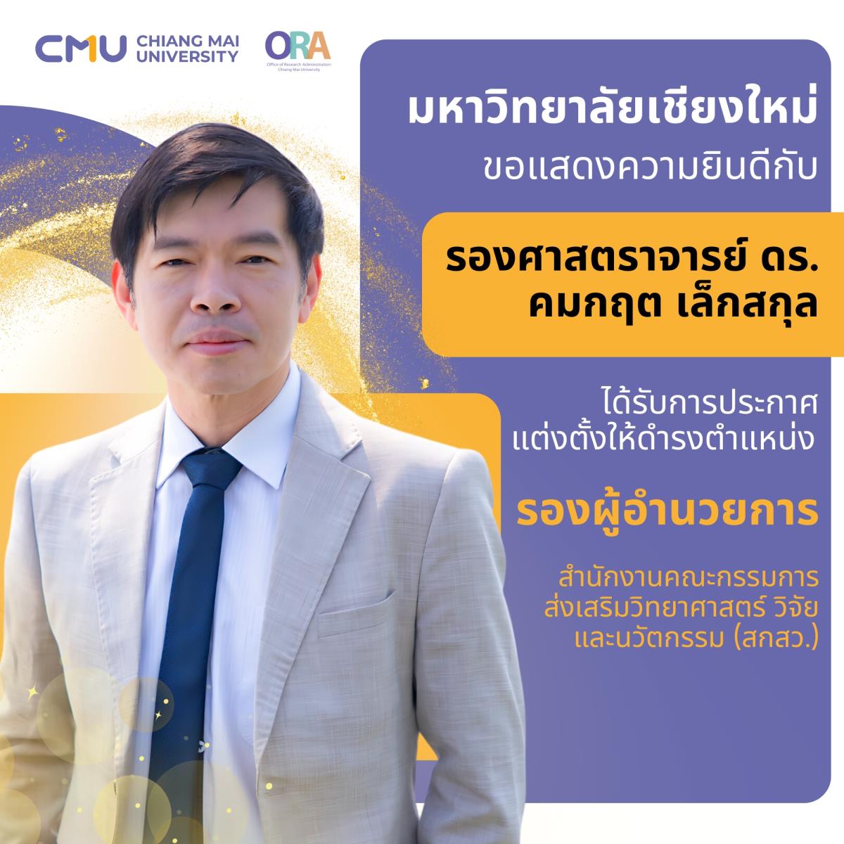 รองศาสตราจารย์ ดร.คมกฤต เล็กสกุล สังกัดคณะวิศวกรรมศาสตร์ ในโอกาสได้รับแต่งตั้งให้ดำรงตำแหน่ง "รองผู้อำนวยการ" สำนักงานคณะกรรมการส่งเสริมวิทยาศาสตร์ วิจัยและนวัตกรรม (สกสว.)