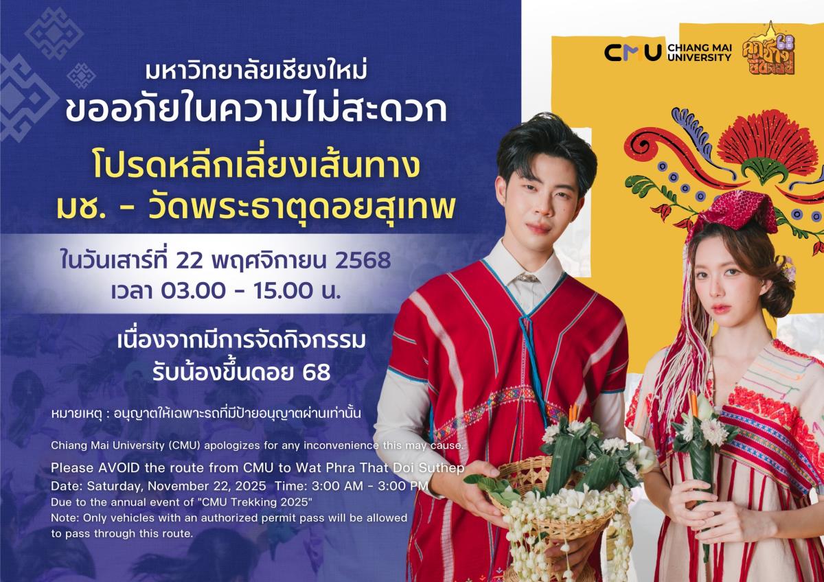 รับน้องขึ้นดอย 2568 คาดว่าจะมีนักศึกษาและผู้เข้าร่วมกิจกรรมเป็นจำนวนมาก ทั้งนักศึกษาใหม่ นักศึกษาปัจจุบัน และพี่ๆ ศิษย์เก่าที่กลับมาให้กำลังให้น้องๆ จึงขอความกรุณาผู้สัญจรโปรดหลีกเลี่ยงเส้นทางจากมหาวิทยาลัยเชียงใหม่ ไปยังวัดพระบรมธาตุดอยสุเทพ และขออภัยในความไม่สะดวกมา ณ โอกาสนี้ด้วย