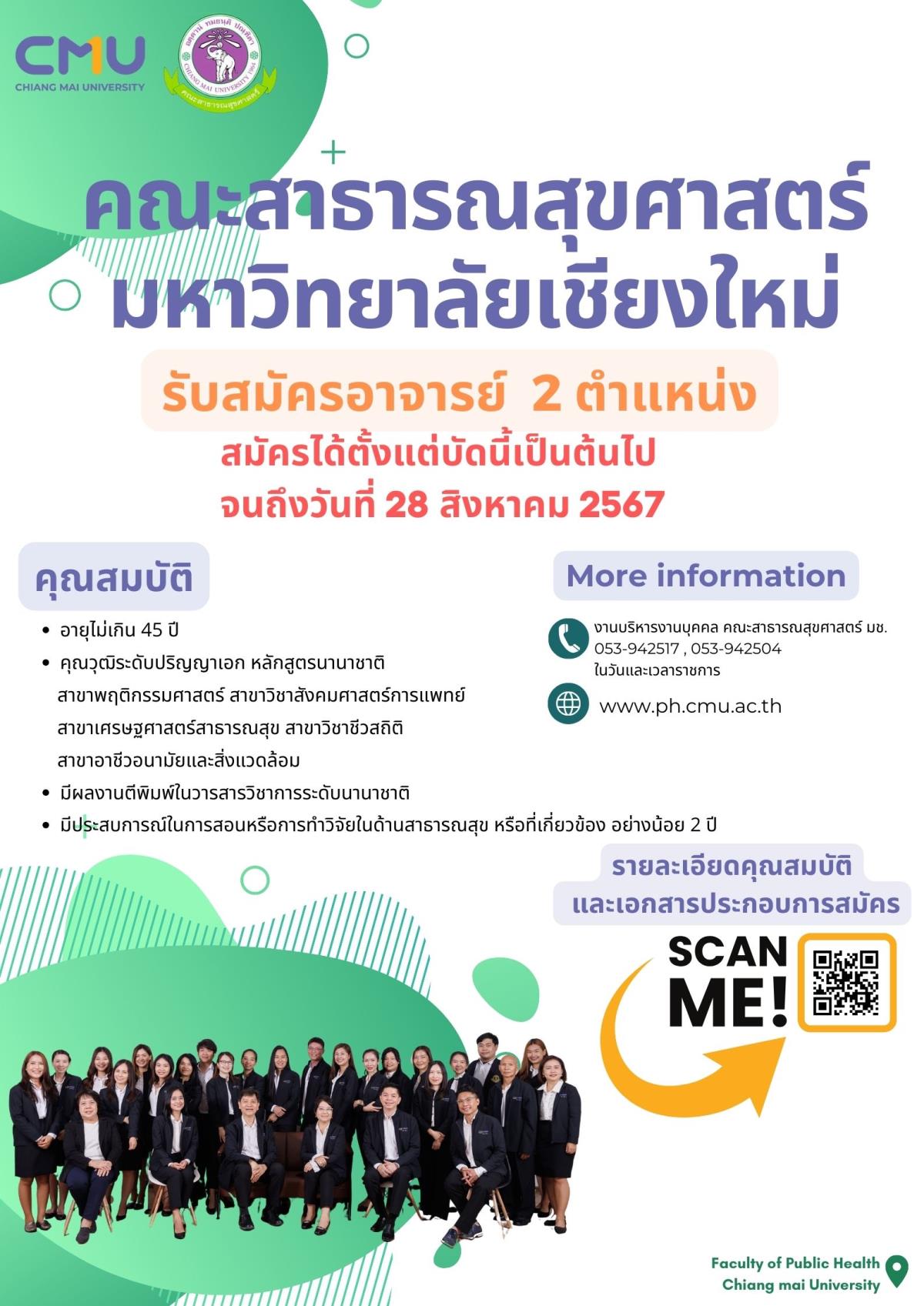 คณะสาธารณสุขศาสตร์ มหาวิทยาลัยเชียงใหม่ ประกาศรับสมัคร อาจารย์ 2 ตำแหน่ง สมัครได้ตั้งแต่บัดนี้ จนถึงวันที่ 28 สิงหาคม 2567 คุณสมบัติ - อายุไม่เกิน 45 ปี -คุณวุฒิระดับปริญญาเอก หลักสูตรนานาชาติ สาขาพฤติกรรมศาสตร์ สาขาวิชาสังคมศาสตร์การแพทย์ สาขาเศรษฐศาสตร์สาธารณสุข สาขาวิชาชีวสถิติ สาขาอาชีวอนามัยและสิ่งแวดล้อม -มีผลงานตีพิมพ์ในวารสารวิชาการระดับนานาชาติ -มีประสบการณ์ในการสอนหรือการทำวิจัยในด้านสาธารณสุข หรือที่เกี่ยวข้อง อย่างน้อย 2 ปี ส่งใบสมัครได้ที่ : ด้วยตนเองที่คณะสาธารณสุขศาสตร์ มหาวิทยาลัยเชียงใหม่ ทางไปรษณีย์ คณะสาธารณสุขศาสตร์ มหาวิทยาลัยเชียงใหม่ เลขที่ 239 ถ.ห้วยแก้ว ต.สุเทพ อ.เมือง จ.เชียงใหม่ 50200 E-mail: phcmu.apply@cmu.ac.th / phcmu.apply@gmail.com ติดต่อสอบถามเพิ่มเติม งานบริหารงานบุคคล คณะสาธารณสุขศาสตร์ มช. 053-942517 , 053-942504 ในวันและเวลาราชการ