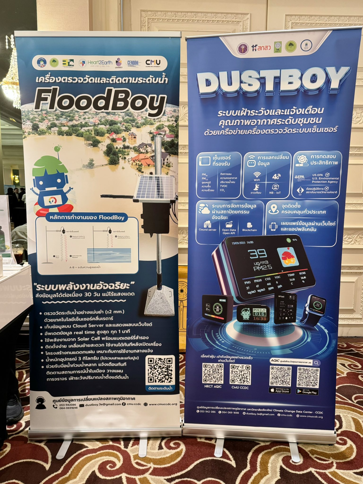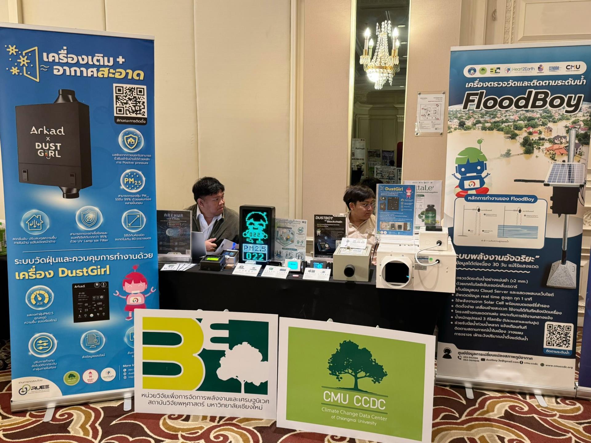 มากกว่า 30 ผลงาน โดยนักวิจัยจาก มช. ได้ระดมพลังองค์ความรู้และงานที่ได้ดำเนินการในการแก้ไขปัญหา PM2.5 และน้ำท่วมมาร่วมจัดแสดง อาทิ น้องฟ้าใสกับภารกิจ Air for All เพื่อฟ้าสดใส การใช้ประโยชน์ข้อมูลขนาดใหญ่เพื่อสนับสนุนการตัดสินใจแก้ปัญหา PM2.5 โดย ศูนย์วิชาการเพื่อสนับสนุนการแก้ไขปัญหาหมอกควันภาคเหนือ มช. ,“โครงการระบบเฝ้าระวังโรคและผลกระทบทางสุขภาพระดับจังหวัดในเขตภาคเหนือตอนบน” โดยคณะสาธารณสุขศาสตร์ , DustBoy: อุปกรณ์ตรวจวัดคุณภาพอากาศแบบต้นทุนต่ำ (Low Cost Sensor) DustGirl: เครื่องเติมอากาศอัจฉริยะ สำหรับปรับปรุงคุณภาพอากาศภายในอาคาร FloodBoy: เครื่องตรวจวัดและติดตามระดับน้ำ โดย ศูนย์ข้อมูลการเปลี่ยนแปลงสภาพภูมิอากาศ มหาวิทยาลัยเชียงใหม่ (CCDC) , ระบบเตือนภัยน้ำท่วมเมืองเชียงใหม่ โดยศูนย์วิชาการสนับสนุนด้านการบริหารจัดการน้ำ มช. และอีกหลายๆ ผลงานจากส่วนงานต่างๆ ของความร่วมมือ มช.